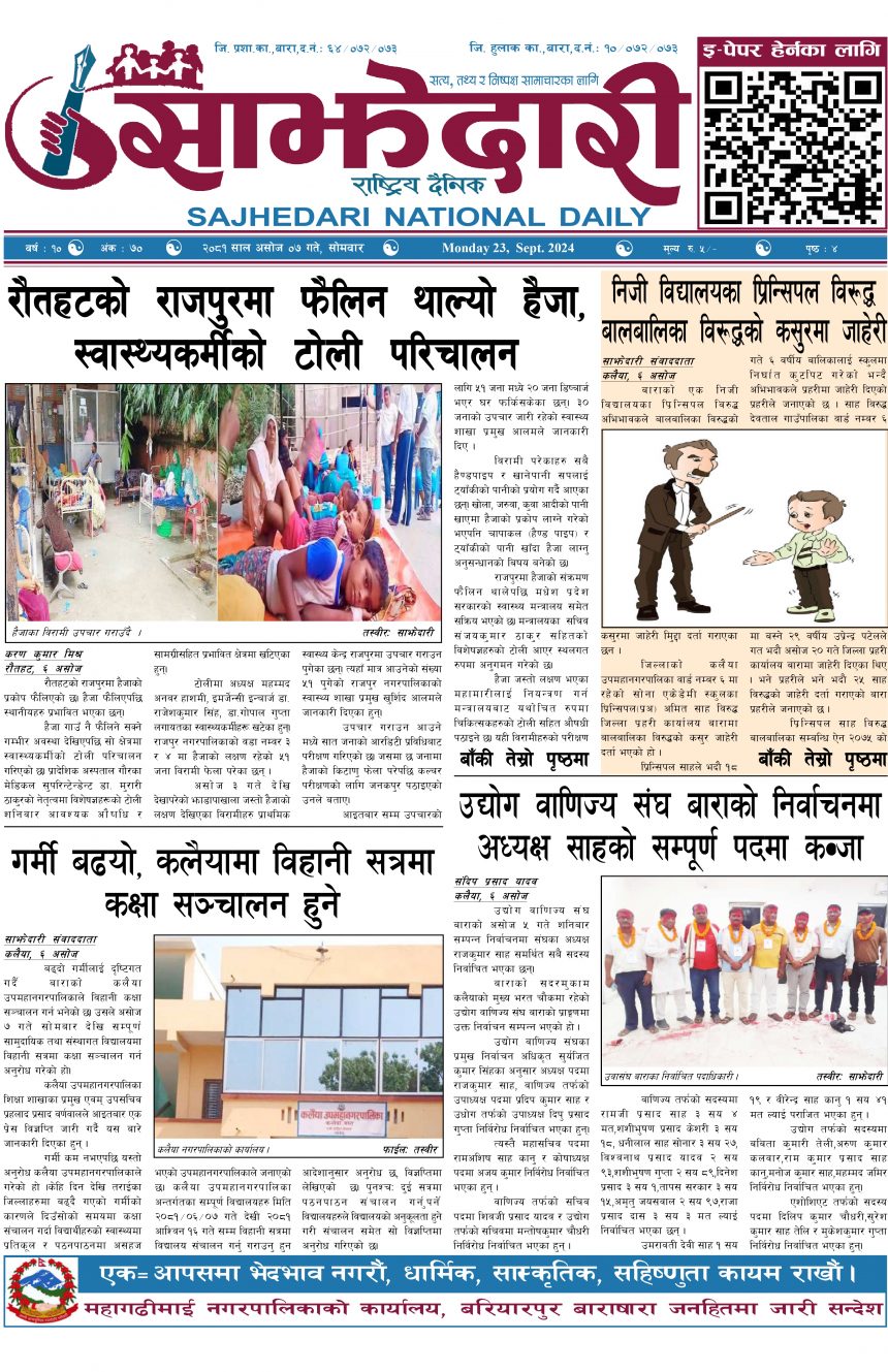 ई–पेपर २०८१ असोज ०८ गते । साझेदारी दैनिक साझेदारी दैनिक २०८१ आश्विन ९, गते 101 पाठक संख्या शेयर शेयर Leave a review Leave a review Leave a Review Cancel replyYour email address will not be published. Required fields are marked * Please select a rating! Your Rating Rate… Perfect Good Average Not that Bad Very Poor Your Comment *नाम * Your Email * Your website Save my name, email, and website in this browser for the next time I comment. ताजा अपडेट लागुऔषधसहित विभिन्न स्थानबाट २४ जना पक्राउ प्रदेश समाचार समाचार सुनचाँदीको मूल्य घट्यो समाचार भन्सार छली प्रकरणः तीन जनाविरुद्ध अदालतमा मुद्दा, मुख्य अभियुक्तबाट २ करोडभन्दा बढी बिगो दाबी मधेश मुख्य समाचार समाचार जीतपुरको गौशाला जग्गा अतिक्रमण घरटहरा हटाइयो मधेश मुख्य समाचार समाचार बारामा भूतपूर्व सैनिक पुनर्मिलन कार्यक्रम सम्पन्न मधेश समाचार २०८३ वैशाख ०४ गते । साझेदारी दैनिक ई–पेपर पाँच पटक भन्दाबढी ट्राफिक नियम उल्लंघन गर्नेको लाइसेन्स निलम्बन प्रक्रिया सुरु मधेश मुख्य समाचार समाचार मुख्य समाचार बाराका दुई नगरपालिकामा नयाँ प्रमुख प्रशासकीय अधिकृत खटाइए मधेश मुख्य समाचार समाचार पर्सामा नागरिकतासँगै राष्ट्रिय परिचयपत्र मधेश मुख्य समाचार समाचार राजश्व अनुसन्धान कार्यालय पथलैयामा आगलागी, प्रमुखको कार्यकक्ष ध्वस्त मधेश समाचार भाडा वृद्धि पछि सिमरा-काठमाडौं उडानमा यात्रु घटे मधेश मुख्य समाचार समाचार बारामा साढे दुई महिनामा एक करोडभन्दा बढीको अवैध सामान बरामद मधेश मुख्य समाचार समाचार प्रदेश समाचार सांसद साहलाई जीतपुरसिमरा-१७ का वडाबासीद्वारा ध्यानाकर्षणपत्र बुझाइयो मधेश मुख्य समाचार समाचार प्रधानमन्त्री कपको आजको खेलमा मधेस प्रदेश विजयी खेलकुद मधेश समाचार स्थानीय तहसँग मागियो विद्यालय समायोजनको विवरण प्रदेश समाचार समाचार होटेल करण राज प्यालेसमा आधुनिक सुविधासहित स्विमिङ पुल उद्घाटन मधेश मुख्य समाचार समाचार रिलायन्स सुगर एण्ड केमिकल इन्डस्ट्रिजद्वारा उखु क्रसिङ सिजन समापन मधेश मुख्य समाचार समाचार