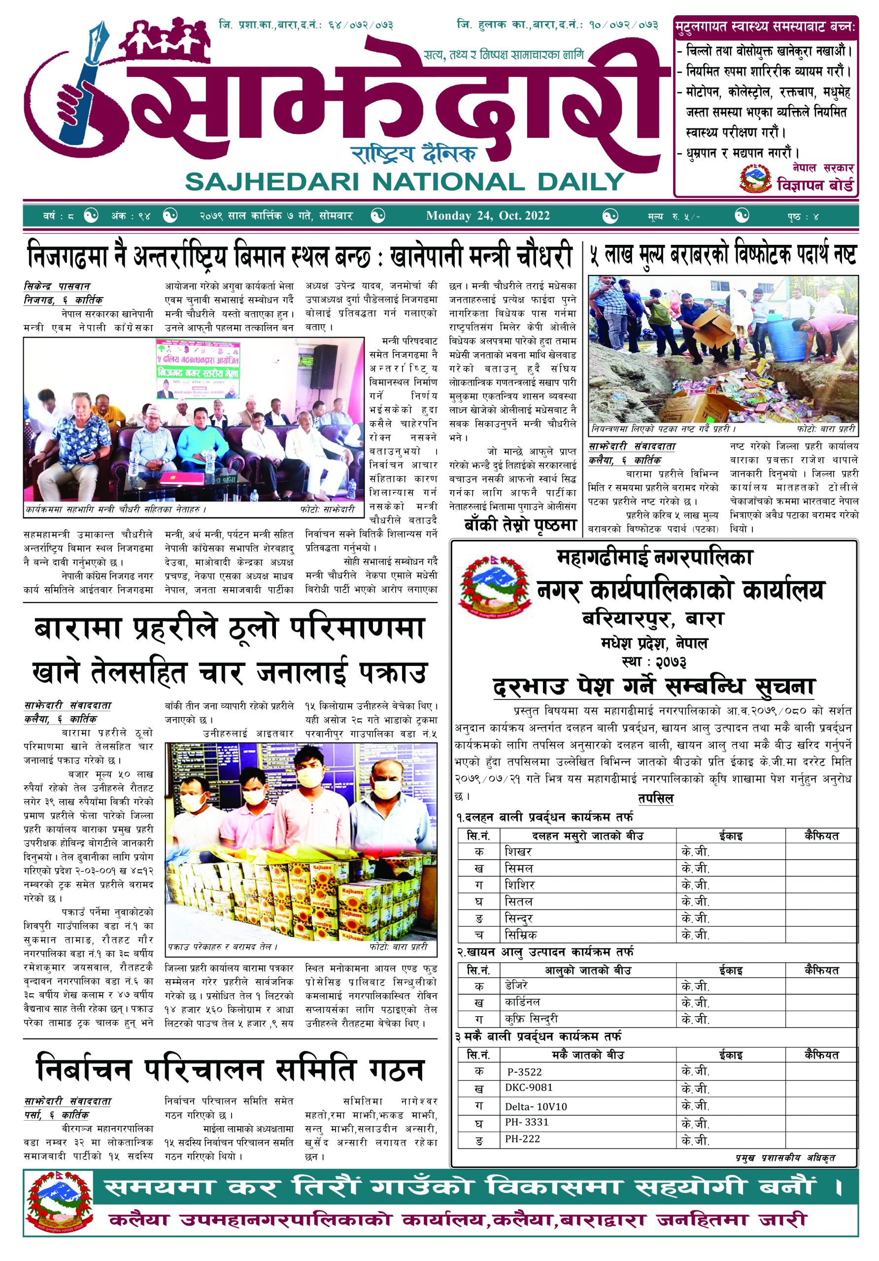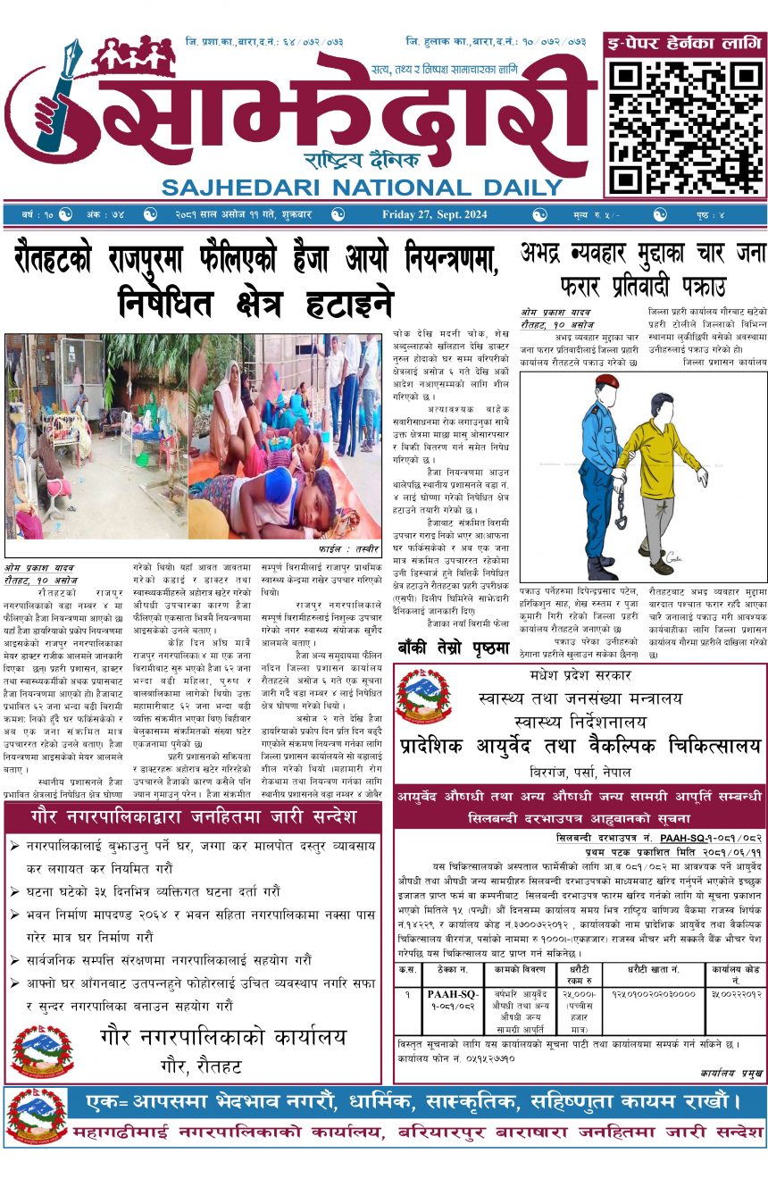 ई–पेपर २०८१ असोज ११ गते । साझेदारी दैनिक साझेदारी दैनिक २०८१ आश्विन ११, गते 214 पाठक संख्या शेयर शेयर Leave a review Leave a review Leave a Review Cancel replyYour email address will not be published. Required fields are marked * Please select a rating! Your Rating Rate… Perfect Good Average Not that Bad Very Poor Your Comment *नाम * Your Email * Your website Save my name, email, and website in this browser for the next time I comment. ताजा अपडेट पेट्रोलियम पदार्थमा गरिएको मूल्य वृद्धि फिर्ता लिन अध्यक्ष घिसिङको माग समाचार पर्सा राष्ट्रिय निकुञ्जमा वन्यजन्तु उद्धार केन्द्र उद्घाटन मधेश समाचार कलैयामा खसी मासुको छालासहित र बिना छालाको छुट्टाछुट्टै मूल्य निर्धारण मधेश समाचार सिम्रौनगढमा छाडा कुकुरको आतंक : एकै घरका ८ खसी-बाख्रा मरे मधेश मुख्य समाचार समाचार २०८३ वैशाख ०७ गते । साझेदारी दैनिक ई–पेपर रेल्वे सेवा ७९ करोड ऋणमा मधेश समाचार सडक विस्तारले वीरगञ्जको विद्युत् अवरुद्ध मधेश मुख्य समाचार समाचार मुख्य समाचार बाईपास विस्तारका लागि २४ घण्टाभित्र संरचना हटाउन वीरगञ्ज महानगरको निर्देशन मधेश मुख्य समाचार समाचार वीरगञ्जमा भर्ना अभियान वैशाख ७ गतेदेखि सुरु हुने मधेश समाचार वीरगन्जमा अतिक्रमित संरचना भत्काउन सुरु मधेश मुख्य समाचार समाचार जीतपुरसिमराको बिद्यालयमा पठनपाठन वैशाख १४ गते देखि सुरु हुने मधेश मुख्य समाचार समाचार करैयामाई -६ सिहोर्वामा नि:शुल्क स्वास्थ्य शिविर सम्पन्न मधेश समाचार स्वास्थ्य प्रदेश समाचार बारामा खेतबाट घर फर्किँदै गर्दा चट्याङ लागेर एक जनाको मृत्यु मधेश मुख्य समाचार समाचार बृन्दावनमा ६ सुकुम्बासी परिवार विस्थापित मधेश समाचार सुनसरीमा काँचो केरासहित चार जना पक्राउ मधेश मुख्य समाचार समाचार दुर्घटना न्यूनीकरणलाई केन्द्रमा राखेर काम गर्न डीआईजी थपलियाको निर्देशन मधेश मुख्य समाचार समाचार कलैयामा घरको ताला तोडेर करिब ५० लाख बराबरको चोरी मधेश मुख्य समाचार समाचार