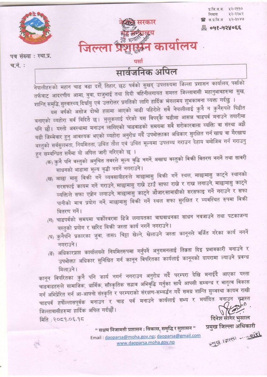 एक सार्वजनिक अपिल जारी गर्दै वडा दशैं,तिहार,छठ पर्व मर्यादित बनाउन उसले शुक्रबार आग्रह गरेको हो। जिल्ला प्रशासन कार्यालय पर्साले वस्तुको अनुचित तवरले मूल्य वृद्धि नगर्न आग्रह गरेको छ।