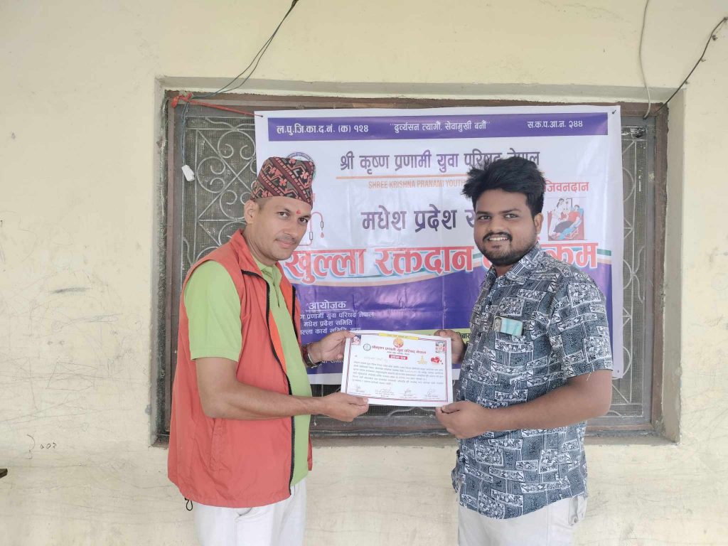 सिमरा, १९ असोज :” दुव्र्यसन त्यागौँ,सेवा मुखी बनौ,” भन्ने मुल नाराका साथ श्रीकृष्ण प्रणामी युवा परिषद नेपाल मधेश प्रदेश समिति तथा जिल्ला कार्य समिति बाराको आयोजनामा आज बाराको फत्तेपुरमा खुल्ला रक्तदान कार्यक्रम सम्पन्न भएको छ ।