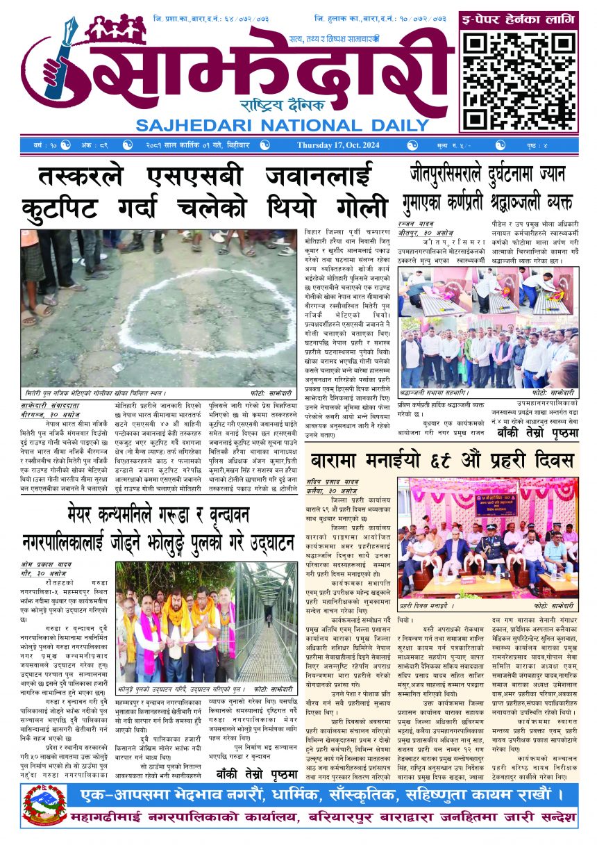 ई–पेपर २०८१ कार्तिक ०१ गते । साझेदारी दैनिक साझेदारी दैनिक २०८१ कार्तिक २, गते 242 पाठक संख्या शेयर शेयर Leave a review Leave a review Leave a Review Cancel replyYour email address will not be published. Required fields are marked * Please select a rating! Your Rating Rate… Perfect Good Average Not that Bad Very Poor Your Comment *नाम * Your Email * Your website Save my name, email, and website in this browser for the next time I comment. ताजा अपडेट आमामाथि कुटपिट गरी भाग्दै गरेका युवक अफिमसहित पक्राउ मधेश समाचार पर्सामा ३० हजार ट्रामाडोल ट्याब्लेटसहित भारतीय नागरिक पक्राउ मधेश समाचार तेइस लाख बालकालिकालाई भिटामिन ‘ए’ खुवाइयो समाचार स्वास्थ्य पर्सामा लागूऔषध गाँजा जस्तो पदार्थसहित चार भारतीय नागरिक पक्राउ मधेश समाचार चक्कु प्रहार गरी युवकको हत्या समाचार बनावटी अडियो काण्ड : प्रहरी वरिष्ठ नायव निरीक्षक सागर शमसेर ज.ब.रा. निलम्बन प्रक्रियामा मधेश मुख्य समाचार समाचार १९ औं स्थापना दिवसको अवसरमा ३७ जनाद्वारा रक्तदान मधेश समाचार मुख्य समाचार वीरगञ्ज भन्सारद्वारा नौ महिनामा एक खर्ब ७७ करोड राजस्व सङ्कलन मधेश समाचार व्यवसाय सञ्चालनमा पारदर्शिता र नियम पालना गर्न जीतपुरसिमरा उद्योग वाणिज्य संघको आग्रह मधेश समाचार पथलैया-चुरियामाई सडक क्षेत्रका संरचना हटाउन ३ दिनको अल्टिमेटम मधेश मुख्य समाचार समाचार सिमरामा ‘केआईईसी’को नयाँ शाखा सञ्चालन,विदेश अध्ययन चाहने विद्यार्थीलाई सहज मधेश मुख्य समाचार समाचार पहिलेको निर्णय फेरियो : कलैयामा अब वैशाख १६ देखि कक्षा सुरु हुने मधेश मुख्य समाचार समाचार प्रदेश समाचार कलैयामा वैशाख १५ गतेदेखि भर्ना अभियान, २१ गतेदेखि पठनपाठन सुरु हुने मधेश मुख्य समाचार समाचार पर्सा राष्ट्रिय निकुञ्जमा वन्यजन्तु उद्धार केन्द्र उद्घाटन मधेश समाचार कलैयामा खसी मासुको छालासहित र बिना छालाको छुट्टाछुट्टै मूल्य निर्धारण मधेश समाचार सिम्रौनगढमा छाडा कुकुरको आतंक : एकै घरका ८ खसी-बाख्रा मरे मधेश मुख्य समाचार समाचार रेल्वे सेवा ७९ करोड ऋणमा मधेश समाचार