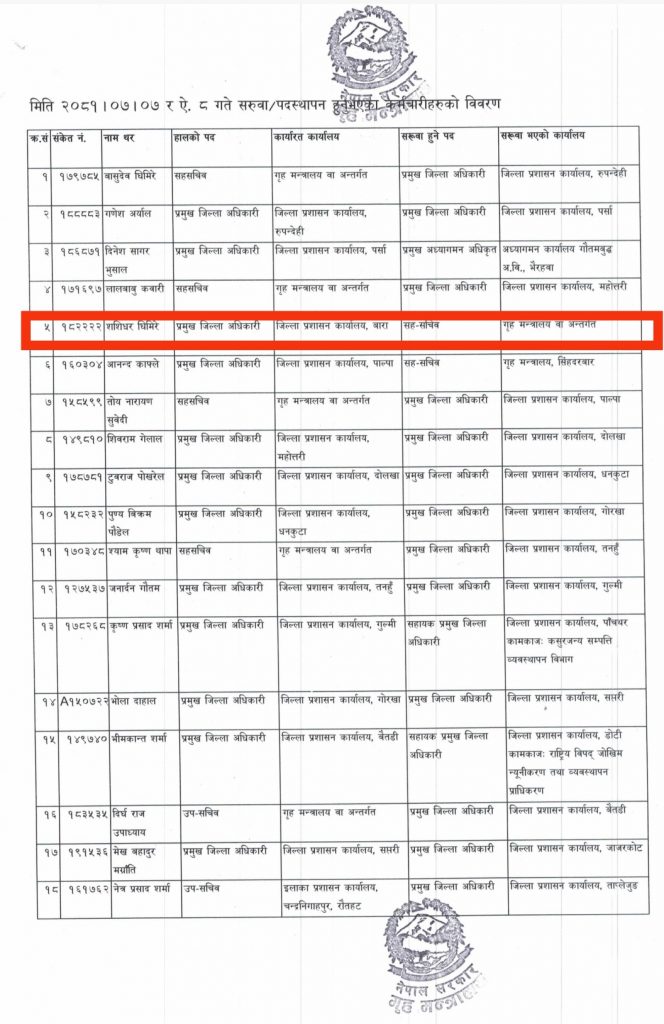 जिल्ला प्रशासन कार्यालय बाराका प्रमुख जिल्ला अधिकारी शशिधर घिमिरेको गृह मन्त्रालयमा सरुवा भएको हो ।