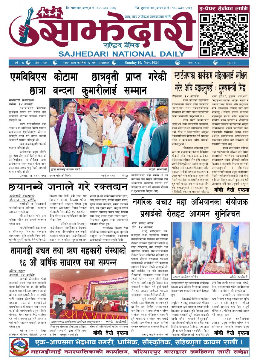 ई–पेपर २०८१ कार्तिक २५ गते । साझेदारी दैनिक साझेदारी दैनिक २०८१ कार्तिक २५, गते 289 पाठक संख्या शेयर शेयर Leave a review Leave a review Leave a Review Cancel replyYour email address will not be published. Required fields are marked * Please select a rating! Your Rating Rate… Perfect Good Average Not that Bad Very Poor Your Comment *नाम * Your Email * Your website Save my name, email, and website in this browser for the next time I comment. ताजा अपडेट सुनचाँदीको मूल्यमा केही गिरावट समाचार नहर अतिक्रमण हटाउन चार सय घरटहरा हटाइँदै मधेश मुख्य समाचार समाचार २०८३ वैशाख १७ गते । साझेदारी दैनिक ई–पेपर डाबर नेपाल अगाडि दुर्घटना : श्रीमान्को मृत्यु, श्रीमती गम्भीर मधेश समाचार यातायात कार्यालय कलैयाबाट भोलिदेखि स्मार्ट लाइसेन्स वितरण सुरु हुने मधेश मुख्य समाचार समाचार घरबारविहीनको व्यवस्थापनको जिम्मा सरकारले लिन्छः सभापति लामिछाने समाचार हावाहुरीका बेला चुँडिएका तार नछुन नेपाल विद्युत प्राधिकरण कलैया वितरण केन्द्रको चेतावनी मधेश समाचार मुख्य समाचार माधवनारायण नगरपालिकाको अत्याधुनिक प्रशासनिक भवन उद्घाटन मधेश समाचार वीरगन्ज हुँदै भित्रियो २६ अर्ब १३ करोडको सवारीसाधन र पार्टपुर्जा मधेश समाचार जितपुरमा प्रहरी इन्चार्जमाथि आर्थिक आतंकको आरोप ,व्यापारीदेखि ट्रान्सपोर्ट व्यवसायीसम्म त्रसित, मासिक लाखौं असुली हुने दाबी मधेश मुख्य समाचार समाचार प्रिन्ट भएको लाइसेन्स अझै नआएको भन्दै यातायात कार्यालय कलैयाको सूचना मधेश मुख्य समाचार समाचार रौतहटमा पूर्वाधार र पर्यटन कार्यालयविरुद्ध जसपाको कडा घेराबन्दी, चरम भ्रष्टाचार र कमिसनखोरीको आरोप मधेश समाचार प्रदेश समाचार वीरगञ्ज नाका हुँदै तीन अर्बको विद्युतीय सवारीसाधन आयात मधेश मुख्य समाचार समाचार जीतपुरसिमरा–६ मा वडा कार्यालय भवन उद्घाटन मधेश समाचार राष्ट्रिय स्वतन्त्र पार्टीको कलैया संयोजकमा उमाशंकर साह रौनियार चयन मधेश राजनीति समाचार परवानीपुरमा कृषि संकलन केन्द्र सञ्चालन, किसानलाई बजार सहज मधेश मुख्य समाचार समाचार सशस्त्र प्रहरी बल नम्बर ११ गण रौतहटद्वारा १९ औँ स्थापना दिवस भव्य रूपमा सम्पन्न मधेश समाचार