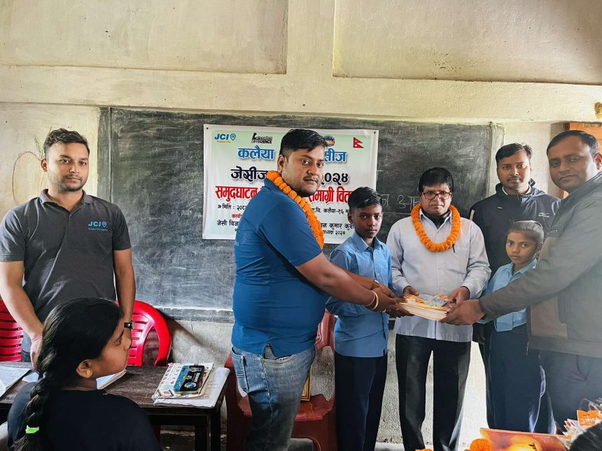 कलैया सिटी जेसिज २०२४ का अध्यक्ष जेसी पवन कुशवाहाको अध्यक्षतामा भएको कलैया उपमहानगरपालिका वडा नम्बर १६ का वडा अध्यक्ष शेषनाथ साहको प्रमुख आतिथ्यतामा उक्त शैक्षिक सामाग्रीहरु वितरण गरिएको जेसिजले जनाएको छ ।