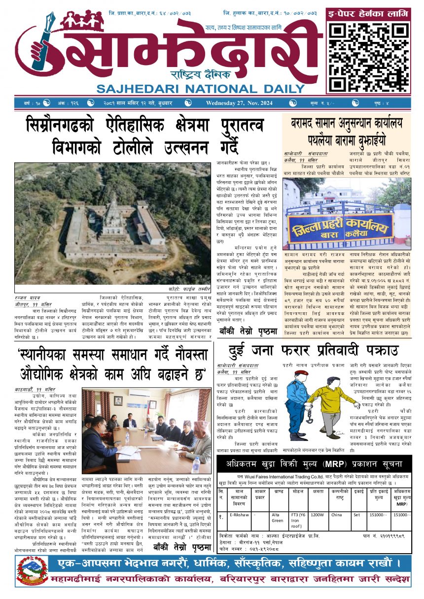 ई–पेपर २०८१ मंसिर १२ गते । साझेदारी दैनिक साझेदारी दैनिक २०८१ मंसिर १२, गते 188 पाठक संख्या शेयर शेयर Leave a review Leave a review Leave a Review Cancel replyYour email address will not be published. Required fields are marked * Please select a rating! Your Rating Rate… Perfect Good Average Not that Bad Very Poor Your Comment *नाम * Your Email * Your website Save my name, email, and website in this browser for the next time I comment. ताजा अपडेट दुर्घटना न्यूनीकरणलाई केन्द्रमा राखेर काम गर्न डीआईजी थपलियाको निर्देशन मधेश मुख्य समाचार समाचार कलैयामा घरको ताला तोडेर करिब ५० लाख बराबरको चोरी मधेश मुख्य समाचार समाचार प्रधानमन्त्री कप क्रिकेटको उपाधि त्रिभुवन आर्मी क्लबलाई खेलकुद मधेश मुख्य समाचार समाचार लागुऔषधसहित विभिन्न स्थानबाट २४ जना पक्राउ प्रदेश समाचार समाचार सुनचाँदीको मूल्य घट्यो समाचार भन्सार छली प्रकरणः तीन जनाविरुद्ध अदालतमा मुद्दा, मुख्य अभियुक्तबाट २ करोडभन्दा बढी बिगो दाबी मधेश मुख्य समाचार समाचार जीतपुरको गौशाला जग्गा अतिक्रमण घरटहरा हटाइयो मधेश मुख्य समाचार समाचार मुख्य समाचार बारामा भूतपूर्व सैनिक पुनर्मिलन कार्यक्रम सम्पन्न मधेश समाचार पाँच पटक भन्दाबढी ट्राफिक नियम उल्लंघन गर्नेको लाइसेन्स निलम्बन प्रक्रिया सुरु मधेश मुख्य समाचार समाचार बाराका दुई नगरपालिकामा नयाँ प्रमुख प्रशासकीय अधिकृत खटाइए मधेश मुख्य समाचार समाचार पर्सामा नागरिकतासँगै राष्ट्रिय परिचयपत्र मधेश मुख्य समाचार समाचार राजश्व अनुसन्धान कार्यालय पथलैयामा आगलागी, प्रमुखको कार्यकक्ष ध्वस्त मधेश समाचार प्रदेश समाचार भाडा वृद्धि पछि सिमरा-काठमाडौं उडानमा यात्रु घटे मधेश मुख्य समाचार समाचार बारामा साढे दुई महिनामा एक करोडभन्दा बढीको अवैध सामान बरामद मधेश मुख्य समाचार समाचार सांसद साहलाई जीतपुरसिमरा-१७ का वडाबासीद्वारा ध्यानाकर्षणपत्र बुझाइयो मधेश मुख्य समाचार समाचार प्रधानमन्त्री कपको आजको खेलमा मधेस प्रदेश विजयी खेलकुद मधेश समाचार स्थानीय तहसँग मागियो विद्यालय समायोजनको विवरण प्रदेश समाचार समाचार