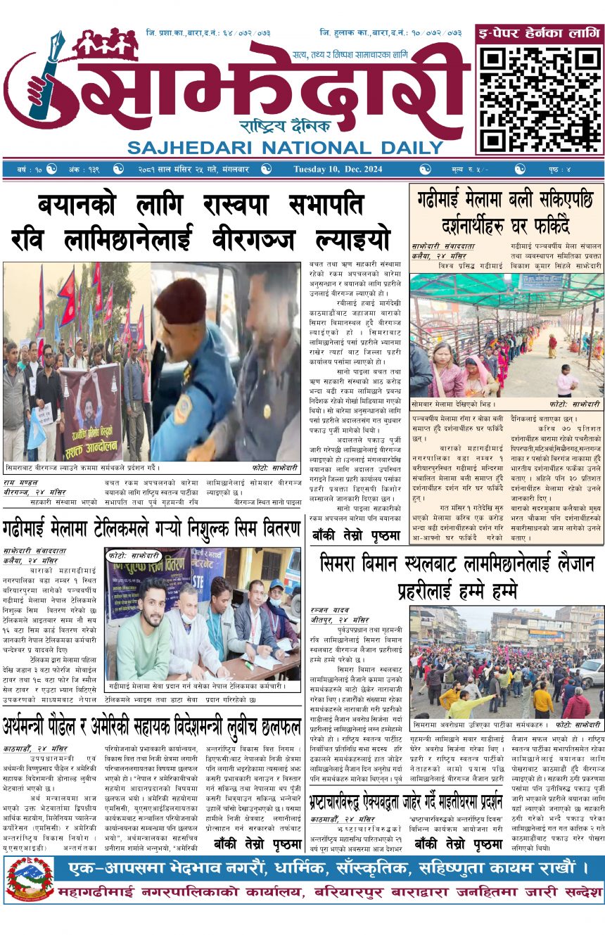 ई–पेपर २०८१ मंसिर २५ गते । साझेदारी दैनिक साझेदारी दैनिक २०८१ मंसिर २५, गते 217 पाठक संख्या शेयर शेयर Leave a review Leave a review Leave a Review Cancel replyYour email address will not be published. Required fields are marked * Please select a rating! Your Rating Rate… Perfect Good Average Not that Bad Very Poor Your Comment *नाम * Your Email * Your website Save my name, email, and website in this browser for the next time I comment. ताजा अपडेट २०८३ वैशाख ०५ गते । साझेदारी दैनिक ई–पेपर दुर्घटना न्यूनीकरणलाई केन्द्रमा राखेर काम गर्न डीआईजी थपलियाको निर्देशन मधेश मुख्य समाचार समाचार कलैयामा घरको ताला तोडेर करिब ५० लाख बराबरको चोरी मधेश मुख्य समाचार समाचार प्रधानमन्त्री कप क्रिकेटको उपाधि त्रिभुवन आर्मी क्लबलाई खेलकुद मधेश मुख्य समाचार समाचार लागुऔषधसहित विभिन्न स्थानबाट २४ जना पक्राउ प्रदेश समाचार समाचार सुनचाँदीको मूल्य घट्यो समाचार भन्सार छली प्रकरणः तीन जनाविरुद्ध अदालतमा मुद्दा, मुख्य अभियुक्तबाट २ करोडभन्दा बढी बिगो दाबी मधेश मुख्य समाचार समाचार मुख्य समाचार जीतपुरको गौशाला जग्गा अतिक्रमण घरटहरा हटाइयो मधेश मुख्य समाचार समाचार बारामा भूतपूर्व सैनिक पुनर्मिलन कार्यक्रम सम्पन्न मधेश समाचार पाँच पटक भन्दाबढी ट्राफिक नियम उल्लंघन गर्नेको लाइसेन्स निलम्बन प्रक्रिया सुरु मधेश मुख्य समाचार समाचार बाराका दुई नगरपालिकामा नयाँ प्रमुख प्रशासकीय अधिकृत खटाइए मधेश मुख्य समाचार समाचार पर्सामा नागरिकतासँगै राष्ट्रिय परिचयपत्र मधेश मुख्य समाचार समाचार प्रदेश समाचार राजश्व अनुसन्धान कार्यालय पथलैयामा आगलागी, प्रमुखको कार्यकक्ष ध्वस्त मधेश समाचार भाडा वृद्धि पछि सिमरा-काठमाडौं उडानमा यात्रु घटे मधेश मुख्य समाचार समाचार बारामा साढे दुई महिनामा एक करोडभन्दा बढीको अवैध सामान बरामद मधेश मुख्य समाचार समाचार सांसद साहलाई जीतपुरसिमरा-१७ का वडाबासीद्वारा ध्यानाकर्षणपत्र बुझाइयो मधेश मुख्य समाचार समाचार प्रधानमन्त्री कपको आजको खेलमा मधेस प्रदेश विजयी खेलकुद मधेश समाचार