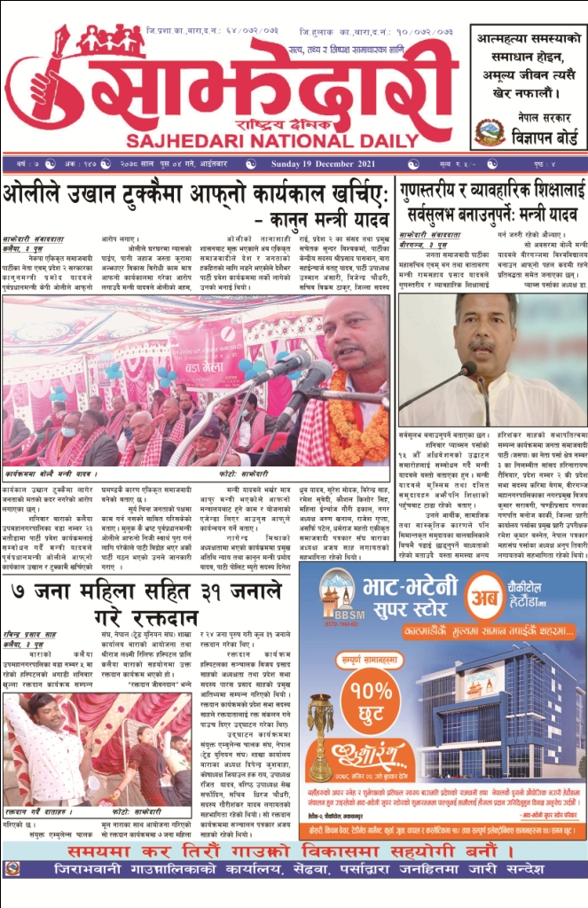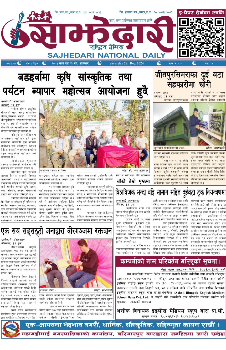 ई–पेपर २०८१ पुस १३ गते । साझेदारी दैनिक साझेदारी दैनिक २०८१ पुष १३, गते 148 पाठक संख्या शेयर शेयर Leave a review Leave a review Leave a Review Cancel replyYour email address will not be published. Required fields are marked * Please select a rating! Your Rating Rate… Perfect Good Average Not that Bad Very Poor Your Comment *नाम * Your Email * Your website Save my name, email, and website in this browser for the next time I comment. ताजा अपडेट २०८३ वैशाख ०५ गते । साझेदारी दैनिक ई–पेपर दुर्घटना न्यूनीकरणलाई केन्द्रमा राखेर काम गर्न डीआईजी थपलियाको निर्देशन मधेश मुख्य समाचार समाचार कलैयामा घरको ताला तोडेर करिब ५० लाख बराबरको चोरी मधेश मुख्य समाचार समाचार प्रधानमन्त्री कप क्रिकेटको उपाधि त्रिभुवन आर्मी क्लबलाई खेलकुद मधेश मुख्य समाचार समाचार लागुऔषधसहित विभिन्न स्थानबाट २४ जना पक्राउ प्रदेश समाचार समाचार सुनचाँदीको मूल्य घट्यो समाचार भन्सार छली प्रकरणः तीन जनाविरुद्ध अदालतमा मुद्दा, मुख्य अभियुक्तबाट २ करोडभन्दा बढी बिगो दाबी मधेश मुख्य समाचार समाचार मुख्य समाचार जीतपुरको गौशाला जग्गा अतिक्रमण घरटहरा हटाइयो मधेश मुख्य समाचार समाचार बारामा भूतपूर्व सैनिक पुनर्मिलन कार्यक्रम सम्पन्न मधेश समाचार पाँच पटक भन्दाबढी ट्राफिक नियम उल्लंघन गर्नेको लाइसेन्स निलम्बन प्रक्रिया सुरु मधेश मुख्य समाचार समाचार बाराका दुई नगरपालिकामा नयाँ प्रमुख प्रशासकीय अधिकृत खटाइए मधेश मुख्य समाचार समाचार पर्सामा नागरिकतासँगै राष्ट्रिय परिचयपत्र मधेश मुख्य समाचार समाचार प्रदेश समाचार राजश्व अनुसन्धान कार्यालय पथलैयामा आगलागी, प्रमुखको कार्यकक्ष ध्वस्त मधेश समाचार भाडा वृद्धि पछि सिमरा-काठमाडौं उडानमा यात्रु घटे मधेश मुख्य समाचार समाचार बारामा साढे दुई महिनामा एक करोडभन्दा बढीको अवैध सामान बरामद मधेश मुख्य समाचार समाचार सांसद साहलाई जीतपुरसिमरा-१७ का वडाबासीद्वारा ध्यानाकर्षणपत्र बुझाइयो मधेश मुख्य समाचार समाचार प्रधानमन्त्री कपको आजको खेलमा मधेस प्रदेश विजयी खेलकुद मधेश समाचार
