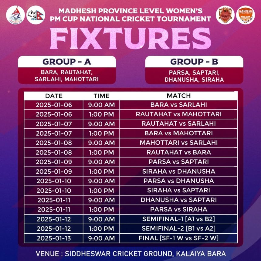निजगढ : नवराज चौलागाईं / मधेश प्रदेश स्तरीय प्रधानमन्त्री कप महिला क्रीकेट प्रतियोगिताको खेल तालिका मधेश प्रदेश क्रीकेट संघले शनिबार सार्वजनिक गरेको छ।