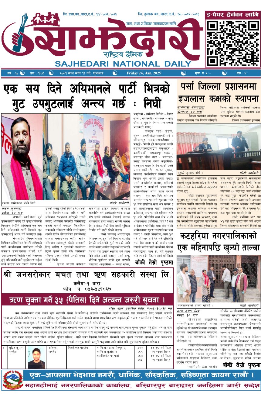 ई–पेपर २०८१ माघ ११ गते । साझेदारी दैनिक साझेदारी दैनिक २०८१ माघ ११, गते 134 पाठक संख्या शेयर शेयर Leave a review Leave a review Leave a Review Cancel replyYour email address will not be published. Required fields are marked * Please select a rating! Your Rating Rate… Perfect Good Average Not that Bad Very Poor Your Comment *नाम * Your Email * Your website Save my name, email, and website in this browser for the next time I comment. ताजा अपडेट २०८३ वैशाख ०५ गते । साझेदारी दैनिक ई–पेपर दुर्घटना न्यूनीकरणलाई केन्द्रमा राखेर काम गर्न डीआईजी थपलियाको निर्देशन मधेश मुख्य समाचार समाचार कलैयामा घरको ताला तोडेर करिब ५० लाख बराबरको चोरी मधेश मुख्य समाचार समाचार प्रधानमन्त्री कप क्रिकेटको उपाधि त्रिभुवन आर्मी क्लबलाई खेलकुद मधेश मुख्य समाचार समाचार लागुऔषधसहित विभिन्न स्थानबाट २४ जना पक्राउ प्रदेश समाचार समाचार सुनचाँदीको मूल्य घट्यो समाचार भन्सार छली प्रकरणः तीन जनाविरुद्ध अदालतमा मुद्दा, मुख्य अभियुक्तबाट २ करोडभन्दा बढी बिगो दाबी मधेश मुख्य समाचार समाचार मुख्य समाचार जीतपुरको गौशाला जग्गा अतिक्रमण घरटहरा हटाइयो मधेश मुख्य समाचार समाचार बारामा भूतपूर्व सैनिक पुनर्मिलन कार्यक्रम सम्पन्न मधेश समाचार पाँच पटक भन्दाबढी ट्राफिक नियम उल्लंघन गर्नेको लाइसेन्स निलम्बन प्रक्रिया सुरु मधेश मुख्य समाचार समाचार बाराका दुई नगरपालिकामा नयाँ प्रमुख प्रशासकीय अधिकृत खटाइए मधेश मुख्य समाचार समाचार पर्सामा नागरिकतासँगै राष्ट्रिय परिचयपत्र मधेश मुख्य समाचार समाचार प्रदेश समाचार राजश्व अनुसन्धान कार्यालय पथलैयामा आगलागी, प्रमुखको कार्यकक्ष ध्वस्त मधेश समाचार भाडा वृद्धि पछि सिमरा-काठमाडौं उडानमा यात्रु घटे मधेश मुख्य समाचार समाचार बारामा साढे दुई महिनामा एक करोडभन्दा बढीको अवैध सामान बरामद मधेश मुख्य समाचार समाचार सांसद साहलाई जीतपुरसिमरा-१७ का वडाबासीद्वारा ध्यानाकर्षणपत्र बुझाइयो मधेश मुख्य समाचार समाचार प्रधानमन्त्री कपको आजको खेलमा मधेस प्रदेश विजयी खेलकुद मधेश समाचार