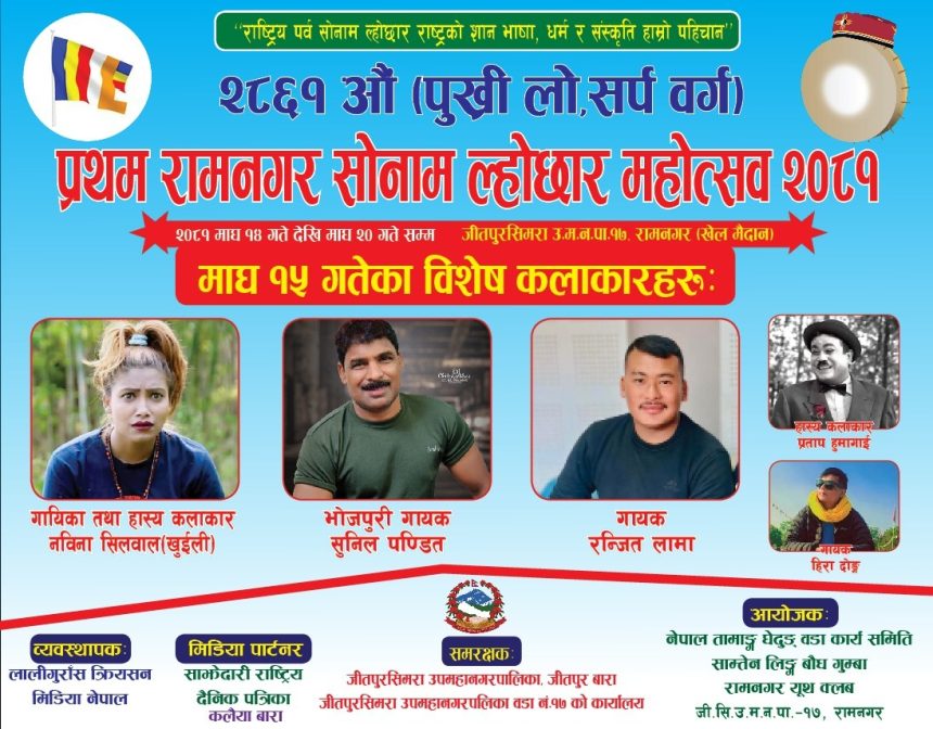 कलैया । बाराको जीतपुरसिमरा १७ रामनगरमा जारी प्रथम रामनगर सोनाम ल्होछार महोत्सवमा आज मंगलबार भोजपुरी सुपरस्टार गायक सुनिल पंडित आउदै छन् ।