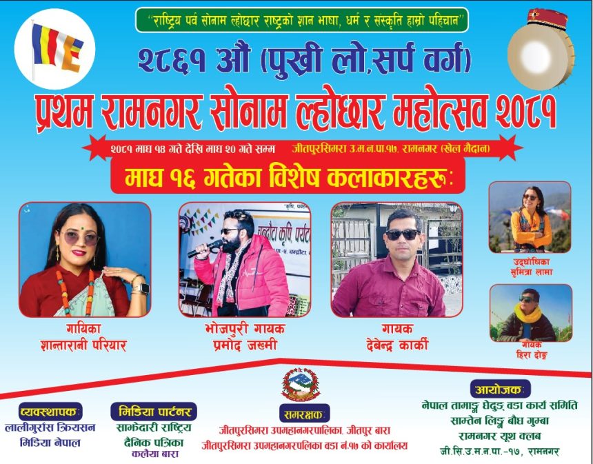 कलैया । बाराको जीतपुरसिमरा १७ रामनगरमा जारी प्रथम रामनगर सोनाम ल्होछार महोत्सवमा आज तेस्रो दिन बुधबार लोकप्रिय गायिका शान्तारानी परियार,गायक देबेन्द्र कार्की र भोजपुरी गायक प्रमोद जख्मी आउदै छन् ।