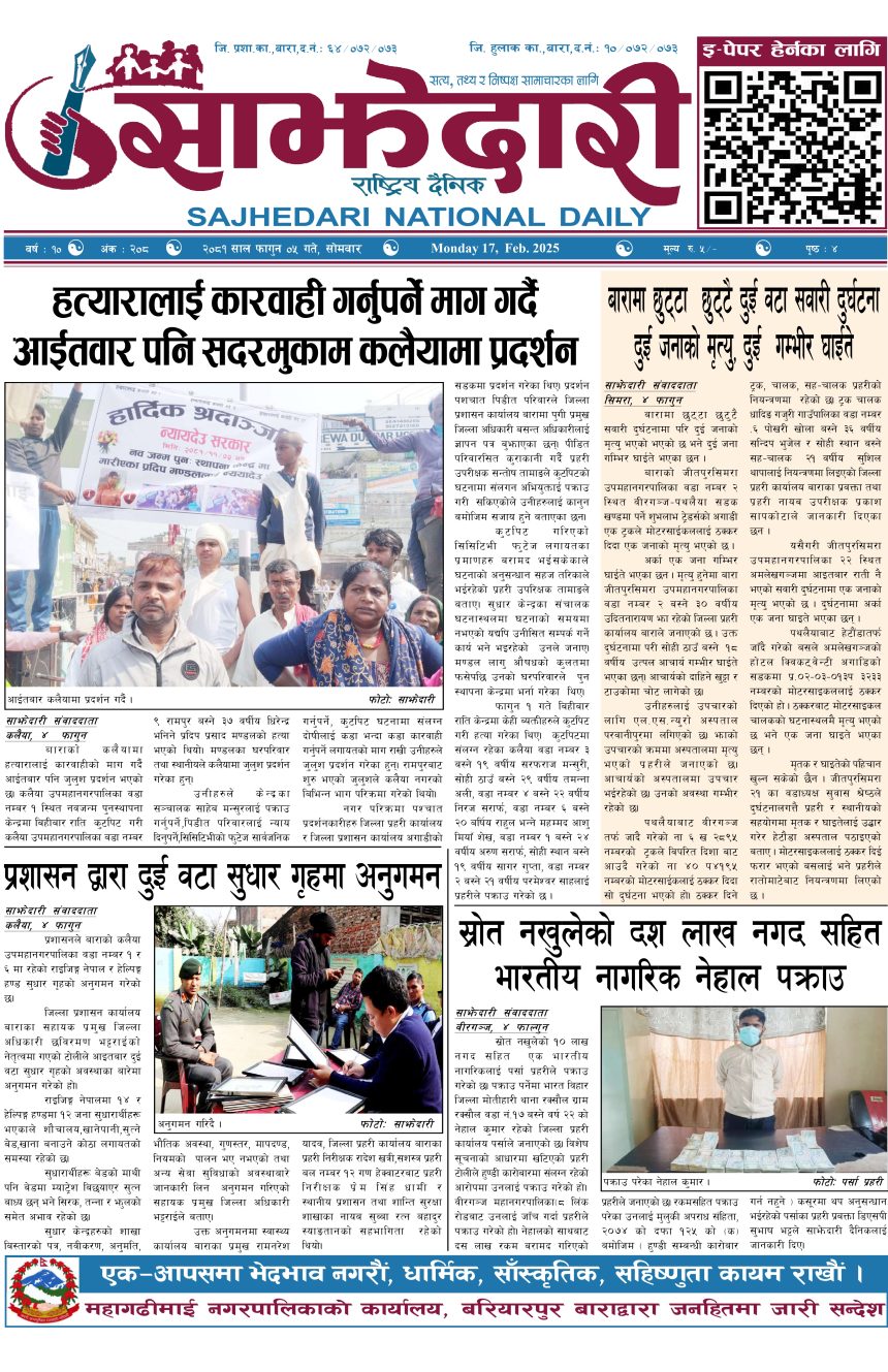 ई–पेपर २०८१ फागुन ०५ गते । साझेदारी दैनिक साझेदारी दैनिक २०८१ फाल्गुन ५, गते 223 पाठक संख्या शेयर शेयर Leave a review Leave a review Leave a Review Cancel replyYour email address will not be published. Required fields are marked * Please select a rating! Your Rating Rate… Perfect Good Average Not that Bad Very Poor Your Comment *नाम * Your Email * Your website Save my name, email, and website in this browser for the next time I comment. ताजा अपडेट दुर्घटना न्यूनीकरणलाई केन्द्रमा राखेर काम गर्न डीआईजी थपलियाको निर्देशन मधेश मुख्य समाचार समाचार कलैयामा घरको ताला तोडेर करिब ५० लाख बराबरको चोरी मधेश मुख्य समाचार समाचार प्रधानमन्त्री कप क्रिकेटको उपाधि त्रिभुवन आर्मी क्लबलाई खेलकुद मधेश मुख्य समाचार समाचार लागुऔषधसहित विभिन्न स्थानबाट २४ जना पक्राउ प्रदेश समाचार समाचार सुनचाँदीको मूल्य घट्यो समाचार भन्सार छली प्रकरणः तीन जनाविरुद्ध अदालतमा मुद्दा, मुख्य अभियुक्तबाट २ करोडभन्दा बढी बिगो दाबी मधेश मुख्य समाचार समाचार जीतपुरको गौशाला जग्गा अतिक्रमण घरटहरा हटाइयो मधेश मुख्य समाचार समाचार मुख्य समाचार बारामा भूतपूर्व सैनिक पुनर्मिलन कार्यक्रम सम्पन्न मधेश समाचार पाँच पटक भन्दाबढी ट्राफिक नियम उल्लंघन गर्नेको लाइसेन्स निलम्बन प्रक्रिया सुरु मधेश मुख्य समाचार समाचार बाराका दुई नगरपालिकामा नयाँ प्रमुख प्रशासकीय अधिकृत खटाइए मधेश मुख्य समाचार समाचार पर्सामा नागरिकतासँगै राष्ट्रिय परिचयपत्र मधेश मुख्य समाचार समाचार राजश्व अनुसन्धान कार्यालय पथलैयामा आगलागी, प्रमुखको कार्यकक्ष ध्वस्त मधेश समाचार प्रदेश समाचार भाडा वृद्धि पछि सिमरा-काठमाडौं उडानमा यात्रु घटे मधेश मुख्य समाचार समाचार बारामा साढे दुई महिनामा एक करोडभन्दा बढीको अवैध सामान बरामद मधेश मुख्य समाचार समाचार सांसद साहलाई जीतपुरसिमरा-१७ का वडाबासीद्वारा ध्यानाकर्षणपत्र बुझाइयो मधेश मुख्य समाचार समाचार प्रधानमन्त्री कपको आजको खेलमा मधेस प्रदेश विजयी खेलकुद मधेश समाचार स्थानीय तहसँग मागियो विद्यालय समायोजनको विवरण प्रदेश समाचार समाचार