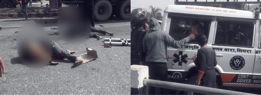 अर्का एक जना गम्भिर घाईते भएका छन । मृत्यु हुनेमा बारा जीतपुरसिमरा उपमहानगरपालिका वडा नम्बर २ बस्ने ३० वर्षीय उदितनारायण झा रहेको जिल्ला प्रहरी कार्यालय बाराले जनाएको छ । उक्त दुर्घटनामा परी सोही ठाउँ बस्ने १८ वर्षीय उत्पल आचार्य गम्भीर घाईते भएका छन्। आचार्यको दाहिने खुट्टा र टाउकोमा चोट लागेको छ।