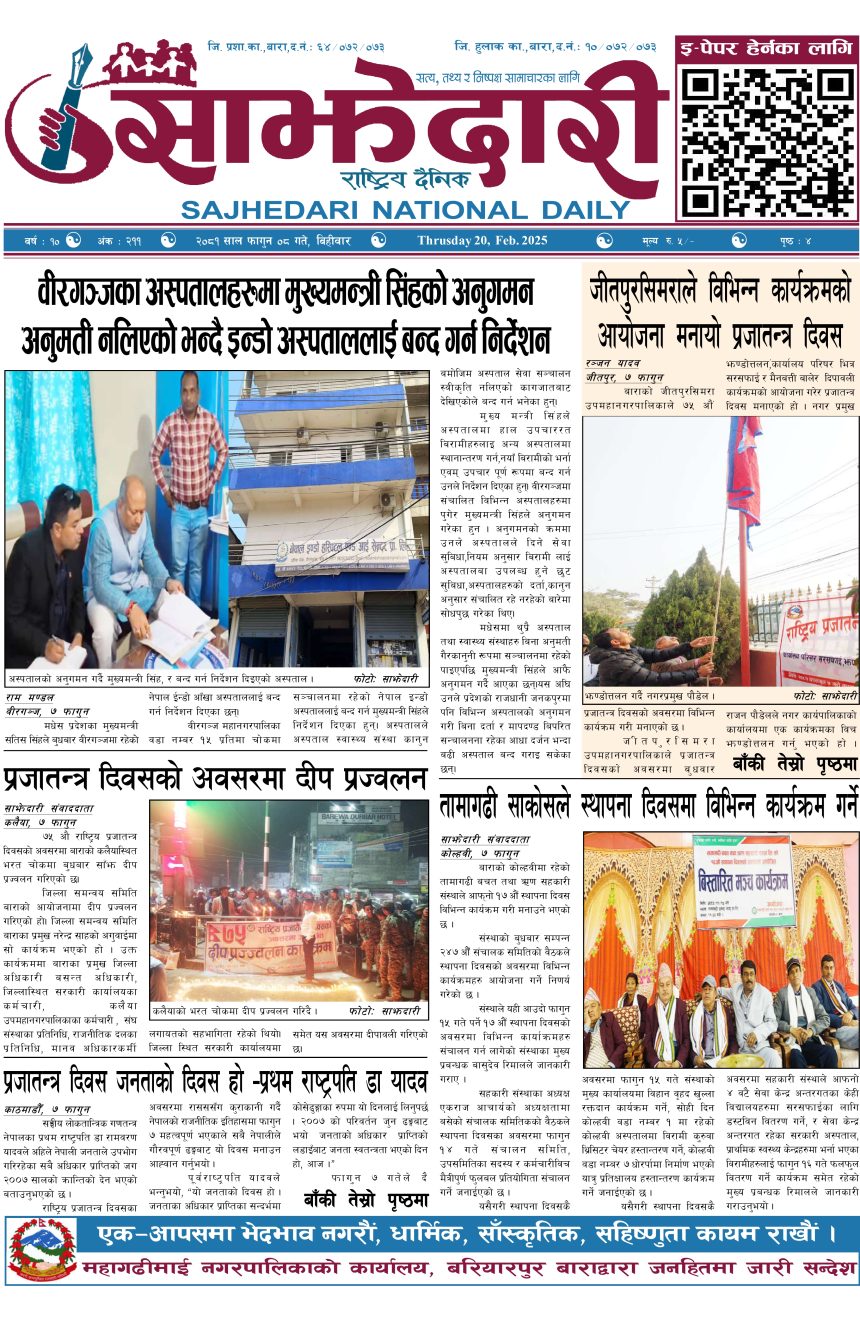 ई–पेपर २०८१ फागुन ०९ गते । साझेदारी दैनिक साझेदारी दैनिक २०८१ फाल्गुन १०, गते 92 पाठक संख्या शेयर शेयर Leave a review Leave a review Leave a Review Cancel replyYour email address will not be published. Required fields are marked * Please select a rating! Your Rating Rate… Perfect Good Average Not that Bad Very Poor Your Comment *नाम * Your Email * Your website Save my name, email, and website in this browser for the next time I comment. ताजा अपडेट कलैयाका व्यवसायीमाथि नगर प्रहरीको बर्बरता: पसलभित्रै छिरेर व्यवसायीलाई लछारपछार मधेश मुख्य समाचार समाचार आमामाथि कुटपिट गरी भाग्दै गरेका युवक अफिमसहित पक्राउ मधेश समाचार पर्सामा ३० हजार ट्रामाडोल ट्याब्लेटसहित भारतीय नागरिक पक्राउ मधेश समाचार तेइस लाख बालकालिकालाई भिटामिन ‘ए’ खुवाइयो समाचार स्वास्थ्य पर्सामा लागूऔषध गाँजा जस्तो पदार्थसहित चार भारतीय नागरिक पक्राउ मधेश समाचार चक्कु प्रहार गरी युवकको हत्या समाचार बनावटी अडियो काण्ड : प्रहरी वरिष्ठ नायव निरीक्षक सागर शमसेर ज.ब.रा. निलम्बन प्रक्रियामा मधेश मुख्य समाचार समाचार मुख्य समाचार १९ औं स्थापना दिवसको अवसरमा ३७ जनाद्वारा रक्तदान मधेश समाचार वीरगञ्ज भन्सारद्वारा नौ महिनामा एक खर्ब ७७ करोड राजस्व सङ्कलन मधेश समाचार व्यवसाय सञ्चालनमा पारदर्शिता र नियम पालना गर्न जीतपुरसिमरा उद्योग वाणिज्य संघको आग्रह मधेश समाचार पथलैया-चुरियामाई सडक क्षेत्रका संरचना हटाउन ३ दिनको अल्टिमेटम मधेश मुख्य समाचार समाचार सिमरामा ‘केआईईसी’को नयाँ शाखा सञ्चालन,विदेश अध्ययन चाहने विद्यार्थीलाई सहज मधेश मुख्य समाचार समाचार प्रदेश समाचार पहिलेको निर्णय फेरियो : कलैयामा अब वैशाख १६ देखि कक्षा सुरु हुने मधेश मुख्य समाचार समाचार कलैयामा वैशाख १५ गतेदेखि भर्ना अभियान, २१ गतेदेखि पठनपाठन सुरु हुने मधेश मुख्य समाचार समाचार पर्सा राष्ट्रिय निकुञ्जमा वन्यजन्तु उद्धार केन्द्र उद्घाटन मधेश समाचार कलैयामा खसी मासुको छालासहित र बिना छालाको छुट्टाछुट्टै मूल्य निर्धारण मधेश समाचार सिम्रौनगढमा छाडा कुकुरको आतंक : एकै घरका ८ खसी-बाख्रा मरे मधेश मुख्य समाचार समाचार