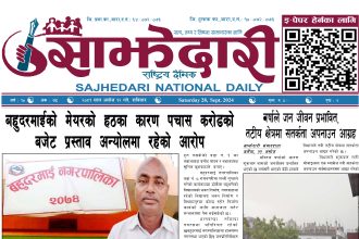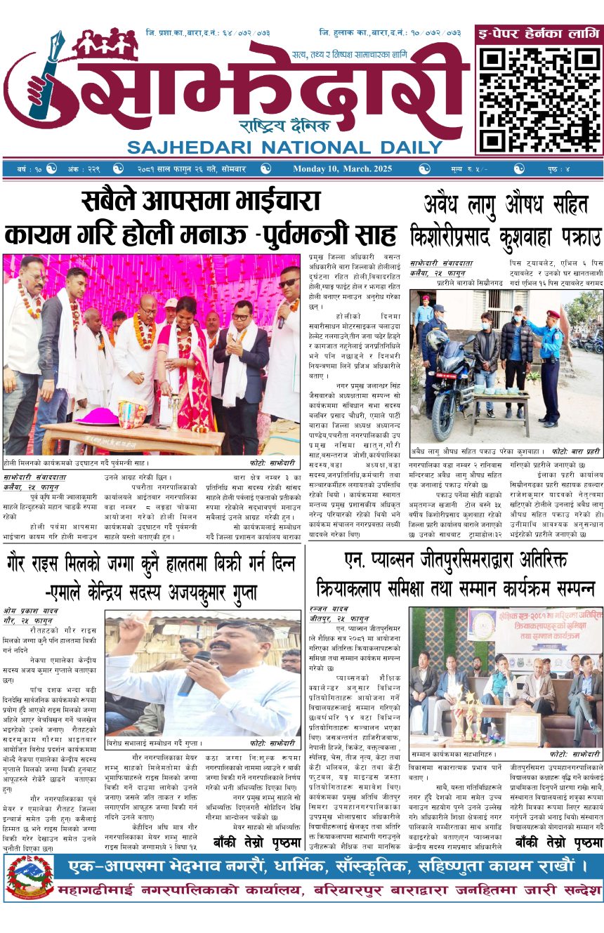 ई–पेपर २०८१ फागुन २६ गते । साझेदारी दैनिक साझेदारी दैनिक २०८१ फाल्गुन २७, गते 202 पाठक संख्या शेयर शेयर Leave a review Leave a review Leave a Review Cancel replyYour email address will not be published. Required fields are marked * Please select a rating! Your Rating Rate… Perfect Good Average Not that Bad Very Poor Your Comment *नाम * Your Email * Your website Save my name, email, and website in this browser for the next time I comment. ताजा अपडेट बाईपास विस्तारका लागि २४ घण्टाभित्र संरचना हटाउन वीरगञ्ज महानगरको निर्देशन मधेश मुख्य समाचार समाचार वीरगञ्जमा भर्ना अभियान वैशाख ७ गतेदेखि सुरु हुने मधेश समाचार वीरगन्जमा अतिक्रमित संरचना भत्काउन सुरु मधेश मुख्य समाचार समाचार जीतपुरसिमराको बिद्यालयमा पठनपाठन वैशाख १४ गते देखि सुरु हुने मधेश मुख्य समाचार समाचार २०८३ वैशाख ०६ गते । साझेदारी दैनिक ई–पेपर करैयामाई -६ सिहोर्वामा नि:शुल्क स्वास्थ्य शिविर सम्पन्न मधेश समाचार स्वास्थ्य बारामा खेतबाट घर फर्किँदै गर्दा चट्याङ लागेर एक जनाको मृत्यु मधेश मुख्य समाचार समाचार मुख्य समाचार बृन्दावनमा ६ सुकुम्बासी परिवार विस्थापित मधेश समाचार सुनसरीमा काँचो केरासहित चार जना पक्राउ मधेश मुख्य समाचार समाचार दुर्घटना न्यूनीकरणलाई केन्द्रमा राखेर काम गर्न डीआईजी थपलियाको निर्देशन मधेश मुख्य समाचार समाचार कलैयामा घरको ताला तोडेर करिब ५० लाख बराबरको चोरी मधेश मुख्य समाचार समाचार प्रधानमन्त्री कप क्रिकेटको उपाधि त्रिभुवन आर्मी क्लबलाई खेलकुद मधेश मुख्य समाचार समाचार प्रदेश समाचार लागुऔषधसहित विभिन्न स्थानबाट २४ जना पक्राउ प्रदेश समाचार समाचार भन्सार छली प्रकरणः तीन जनाविरुद्ध अदालतमा मुद्दा, मुख्य अभियुक्तबाट २ करोडभन्दा बढी बिगो दाबी मधेश मुख्य समाचार समाचार जीतपुरको गौशाला जग्गा अतिक्रमण घरटहरा हटाइयो मधेश मुख्य समाचार समाचार बारामा भूतपूर्व सैनिक पुनर्मिलन कार्यक्रम सम्पन्न मधेश समाचार पाँच पटक भन्दाबढी ट्राफिक नियम उल्लंघन गर्नेको लाइसेन्स निलम्बन प्रक्रिया सुरु मधेश मुख्य समाचार समाचार
