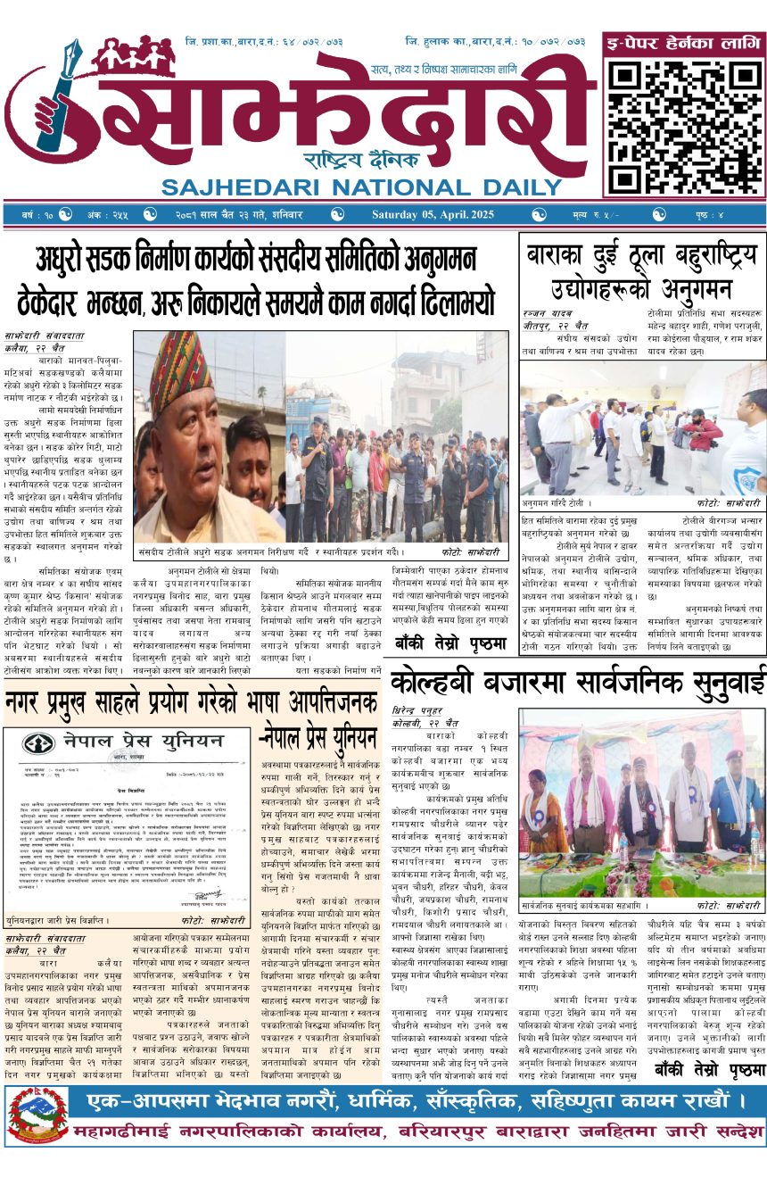 ई–पेपर २०८१ चैत २४ गते । साझेदारी दैनिक साझेदारी दैनिक २०८१ चैत्र २४, गते 150 पाठक संख्या शेयर शेयर Leave a review Leave a review Leave a Review Cancel replyYour email address will not be published. Required fields are marked * Please select a rating! Your Rating Rate… Perfect Good Average Not that Bad Very Poor Your Comment *नाम * Your Email * Your website Save my name, email, and website in this browser for the next time I comment. ताजा अपडेट २०८३ वैशाख ०५ गते । साझेदारी दैनिक ई–पेपर दुर्घटना न्यूनीकरणलाई केन्द्रमा राखेर काम गर्न डीआईजी थपलियाको निर्देशन मधेश मुख्य समाचार समाचार कलैयामा घरको ताला तोडेर करिब ५० लाख बराबरको चोरी मधेश मुख्य समाचार समाचार प्रधानमन्त्री कप क्रिकेटको उपाधि त्रिभुवन आर्मी क्लबलाई खेलकुद मधेश मुख्य समाचार समाचार लागुऔषधसहित विभिन्न स्थानबाट २४ जना पक्राउ प्रदेश समाचार समाचार सुनचाँदीको मूल्य घट्यो समाचार भन्सार छली प्रकरणः तीन जनाविरुद्ध अदालतमा मुद्दा, मुख्य अभियुक्तबाट २ करोडभन्दा बढी बिगो दाबी मधेश मुख्य समाचार समाचार मुख्य समाचार जीतपुरको गौशाला जग्गा अतिक्रमण घरटहरा हटाइयो मधेश मुख्य समाचार समाचार बारामा भूतपूर्व सैनिक पुनर्मिलन कार्यक्रम सम्पन्न मधेश समाचार पाँच पटक भन्दाबढी ट्राफिक नियम उल्लंघन गर्नेको लाइसेन्स निलम्बन प्रक्रिया सुरु मधेश मुख्य समाचार समाचार बाराका दुई नगरपालिकामा नयाँ प्रमुख प्रशासकीय अधिकृत खटाइए मधेश मुख्य समाचार समाचार पर्सामा नागरिकतासँगै राष्ट्रिय परिचयपत्र मधेश मुख्य समाचार समाचार प्रदेश समाचार राजश्व अनुसन्धान कार्यालय पथलैयामा आगलागी, प्रमुखको कार्यकक्ष ध्वस्त मधेश समाचार भाडा वृद्धि पछि सिमरा-काठमाडौं उडानमा यात्रु घटे मधेश मुख्य समाचार समाचार बारामा साढे दुई महिनामा एक करोडभन्दा बढीको अवैध सामान बरामद मधेश मुख्य समाचार समाचार सांसद साहलाई जीतपुरसिमरा-१७ का वडाबासीद्वारा ध्यानाकर्षणपत्र बुझाइयो मधेश मुख्य समाचार समाचार प्रधानमन्त्री कपको आजको खेलमा मधेस प्रदेश विजयी खेलकुद मधेश समाचार