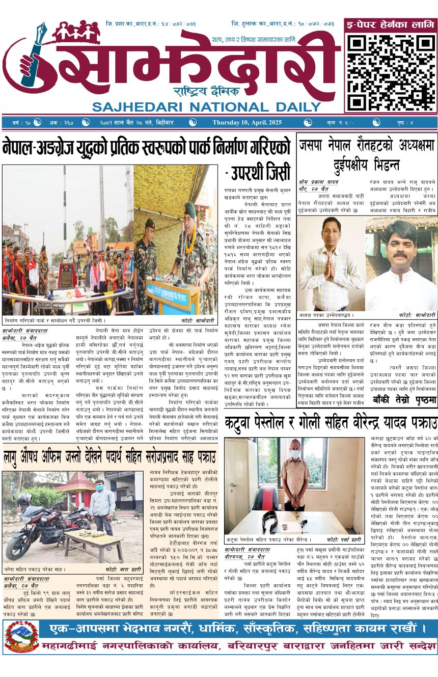 ई–पेपर २०८१ चैत २८ गते । साझेदारी दैनिक साझेदारी दैनिक २०८१ चैत्र २८, गते 326 पाठक संख्या शेयर शेयर Leave a review Leave a review Leave a Review Cancel replyYour email address will not be published. Required fields are marked * Please select a rating! Your Rating Rate… Perfect Good Average Not that Bad Very Poor Your Comment *नाम * Your Email * Your website Save my name, email, and website in this browser for the next time I comment. ताजा अपडेट २०८३ वैशाख ०५ गते । साझेदारी दैनिक ई–पेपर दुर्घटना न्यूनीकरणलाई केन्द्रमा राखेर काम गर्न डीआईजी थपलियाको निर्देशन मधेश मुख्य समाचार समाचार कलैयामा घरको ताला तोडेर करिब ५० लाख बराबरको चोरी मधेश मुख्य समाचार समाचार प्रधानमन्त्री कप क्रिकेटको उपाधि त्रिभुवन आर्मी क्लबलाई खेलकुद मधेश मुख्य समाचार समाचार लागुऔषधसहित विभिन्न स्थानबाट २४ जना पक्राउ प्रदेश समाचार समाचार सुनचाँदीको मूल्य घट्यो समाचार भन्सार छली प्रकरणः तीन जनाविरुद्ध अदालतमा मुद्दा, मुख्य अभियुक्तबाट २ करोडभन्दा बढी बिगो दाबी मधेश मुख्य समाचार समाचार मुख्य समाचार जीतपुरको गौशाला जग्गा अतिक्रमण घरटहरा हटाइयो मधेश मुख्य समाचार समाचार बारामा भूतपूर्व सैनिक पुनर्मिलन कार्यक्रम सम्पन्न मधेश समाचार पाँच पटक भन्दाबढी ट्राफिक नियम उल्लंघन गर्नेको लाइसेन्स निलम्बन प्रक्रिया सुरु मधेश मुख्य समाचार समाचार बाराका दुई नगरपालिकामा नयाँ प्रमुख प्रशासकीय अधिकृत खटाइए मधेश मुख्य समाचार समाचार पर्सामा नागरिकतासँगै राष्ट्रिय परिचयपत्र मधेश मुख्य समाचार समाचार प्रदेश समाचार राजश्व अनुसन्धान कार्यालय पथलैयामा आगलागी, प्रमुखको कार्यकक्ष ध्वस्त मधेश समाचार भाडा वृद्धि पछि सिमरा-काठमाडौं उडानमा यात्रु घटे मधेश मुख्य समाचार समाचार बारामा साढे दुई महिनामा एक करोडभन्दा बढीको अवैध सामान बरामद मधेश मुख्य समाचार समाचार सांसद साहलाई जीतपुरसिमरा-१७ का वडाबासीद्वारा ध्यानाकर्षणपत्र बुझाइयो मधेश मुख्य समाचार समाचार प्रधानमन्त्री कपको आजको खेलमा मधेस प्रदेश विजयी खेलकुद मधेश समाचार