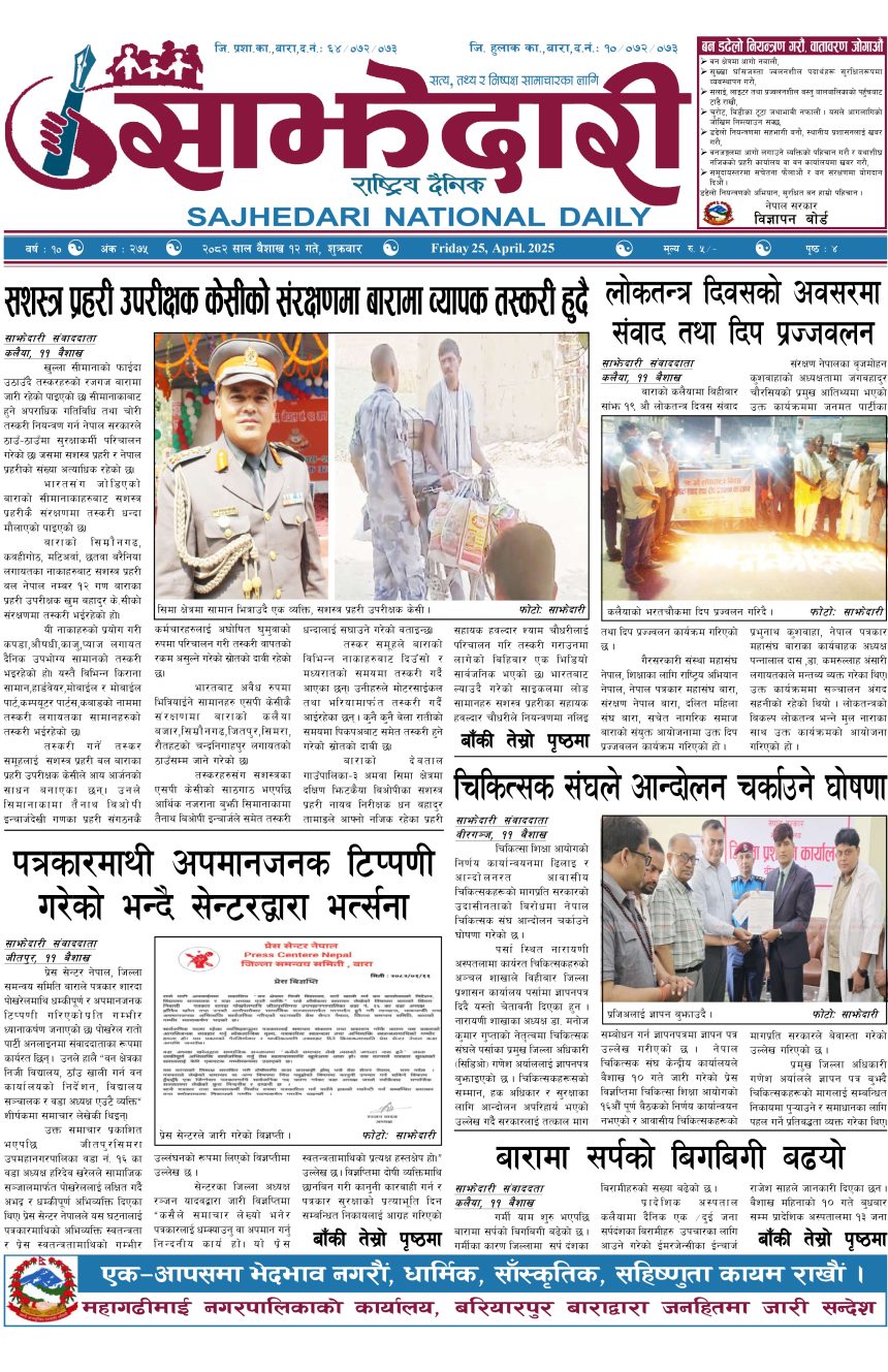 ई–पेपर २०८२ वैशाख १२ गते । साझेदारी दैनिक साझेदारी दैनिक २०८२ बैशाख १२, गते 386 पाठक संख्या शेयर शेयर Leave a review Leave a review Leave a Review Cancel replyYour email address will not be published. Required fields are marked * Please select a rating! Your Rating Rate… Perfect Good Average Not that Bad Very Poor Your Comment *नाम * Your Email * Your website Save my name, email, and website in this browser for the next time I comment. ताजा अपडेट २०८३ वैशाख ०५ गते । साझेदारी दैनिक ई–पेपर दुर्घटना न्यूनीकरणलाई केन्द्रमा राखेर काम गर्न डीआईजी थपलियाको निर्देशन मधेश मुख्य समाचार समाचार कलैयामा घरको ताला तोडेर करिब ५० लाख बराबरको चोरी मधेश मुख्य समाचार समाचार प्रधानमन्त्री कप क्रिकेटको उपाधि त्रिभुवन आर्मी क्लबलाई खेलकुद मधेश मुख्य समाचार समाचार लागुऔषधसहित विभिन्न स्थानबाट २४ जना पक्राउ प्रदेश समाचार समाचार सुनचाँदीको मूल्य घट्यो समाचार भन्सार छली प्रकरणः तीन जनाविरुद्ध अदालतमा मुद्दा, मुख्य अभियुक्तबाट २ करोडभन्दा बढी बिगो दाबी मधेश मुख्य समाचार समाचार मुख्य समाचार जीतपुरको गौशाला जग्गा अतिक्रमण घरटहरा हटाइयो मधेश मुख्य समाचार समाचार बारामा भूतपूर्व सैनिक पुनर्मिलन कार्यक्रम सम्पन्न मधेश समाचार पाँच पटक भन्दाबढी ट्राफिक नियम उल्लंघन गर्नेको लाइसेन्स निलम्बन प्रक्रिया सुरु मधेश मुख्य समाचार समाचार बाराका दुई नगरपालिकामा नयाँ प्रमुख प्रशासकीय अधिकृत खटाइए मधेश मुख्य समाचार समाचार पर्सामा नागरिकतासँगै राष्ट्रिय परिचयपत्र मधेश मुख्य समाचार समाचार प्रदेश समाचार राजश्व अनुसन्धान कार्यालय पथलैयामा आगलागी, प्रमुखको कार्यकक्ष ध्वस्त मधेश समाचार भाडा वृद्धि पछि सिमरा-काठमाडौं उडानमा यात्रु घटे मधेश मुख्य समाचार समाचार बारामा साढे दुई महिनामा एक करोडभन्दा बढीको अवैध सामान बरामद मधेश मुख्य समाचार समाचार सांसद साहलाई जीतपुरसिमरा-१७ का वडाबासीद्वारा ध्यानाकर्षणपत्र बुझाइयो मधेश मुख्य समाचार समाचार प्रधानमन्त्री कपको आजको खेलमा मधेस प्रदेश विजयी खेलकुद मधेश समाचार