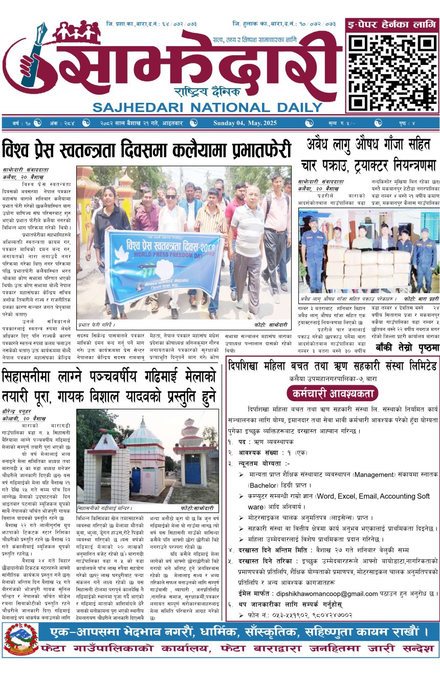 ई–पेपर २०८२ वैशाख २१ गते । साझेदारी दैनिक साझेदारी दैनिक २०८२ बैशाख २१, गते 221 पाठक संख्या शेयर शेयर Leave a review Leave a review Leave a Review Cancel replyYour email address will not be published. Required fields are marked * Please select a rating! Your Rating Rate… Perfect Good Average Not that Bad Very Poor Your Comment *नाम * Your Email * Your website Save my name, email, and website in this browser for the next time I comment. ताजा अपडेट दुर्घटना न्यूनीकरणलाई केन्द्रमा राखेर काम गर्न डीआईजी थपलियाको निर्देशन मधेश मुख्य समाचार समाचार कलैयामा घरको ताला तोडेर करिब ५० लाख बराबरको चोरी मधेश मुख्य समाचार समाचार प्रधानमन्त्री कप क्रिकेटको उपाधि त्रिभुवन आर्मी क्लबलाई खेलकुद मधेश मुख्य समाचार समाचार लागुऔषधसहित विभिन्न स्थानबाट २४ जना पक्राउ प्रदेश समाचार समाचार सुनचाँदीको मूल्य घट्यो समाचार भन्सार छली प्रकरणः तीन जनाविरुद्ध अदालतमा मुद्दा, मुख्य अभियुक्तबाट २ करोडभन्दा बढी बिगो दाबी मधेश मुख्य समाचार समाचार जीतपुरको गौशाला जग्गा अतिक्रमण घरटहरा हटाइयो मधेश मुख्य समाचार समाचार मुख्य समाचार बारामा भूतपूर्व सैनिक पुनर्मिलन कार्यक्रम सम्पन्न मधेश समाचार पाँच पटक भन्दाबढी ट्राफिक नियम उल्लंघन गर्नेको लाइसेन्स निलम्बन प्रक्रिया सुरु मधेश मुख्य समाचार समाचार बाराका दुई नगरपालिकामा नयाँ प्रमुख प्रशासकीय अधिकृत खटाइए मधेश मुख्य समाचार समाचार पर्सामा नागरिकतासँगै राष्ट्रिय परिचयपत्र मधेश मुख्य समाचार समाचार राजश्व अनुसन्धान कार्यालय पथलैयामा आगलागी, प्रमुखको कार्यकक्ष ध्वस्त मधेश समाचार प्रदेश समाचार भाडा वृद्धि पछि सिमरा-काठमाडौं उडानमा यात्रु घटे मधेश मुख्य समाचार समाचार बारामा साढे दुई महिनामा एक करोडभन्दा बढीको अवैध सामान बरामद मधेश मुख्य समाचार समाचार सांसद साहलाई जीतपुरसिमरा-१७ का वडाबासीद्वारा ध्यानाकर्षणपत्र बुझाइयो मधेश मुख्य समाचार समाचार प्रधानमन्त्री कपको आजको खेलमा मधेस प्रदेश विजयी खेलकुद मधेश समाचार स्थानीय तहसँग मागियो विद्यालय समायोजनको विवरण प्रदेश समाचार समाचार