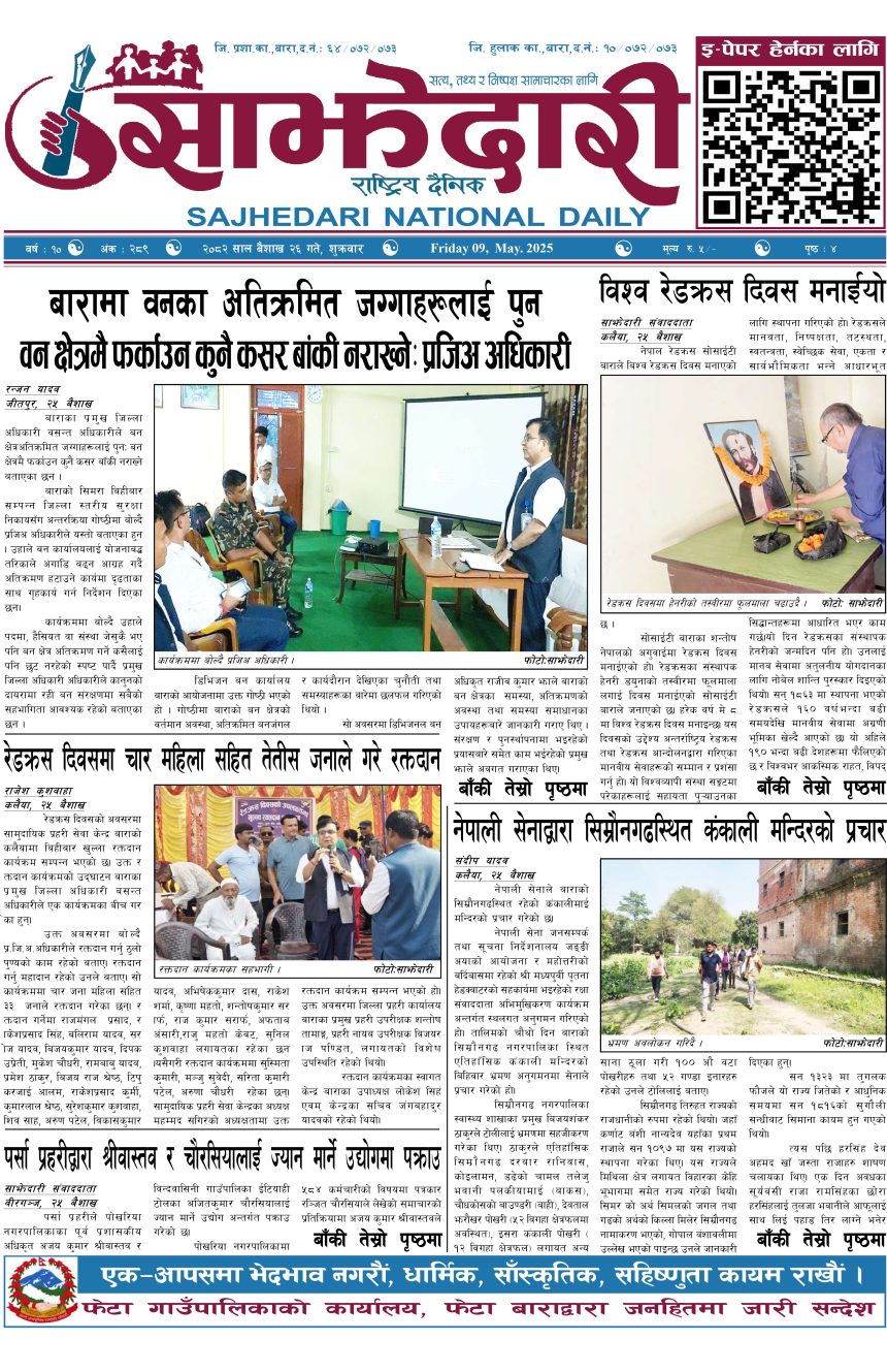ई–पेपर २०८२ वैशाख २६ गते । साझेदारी दैनिक साझेदारी दैनिक २०८२ बैशाख २६, गते 273 पाठक संख्या शेयर शेयर Leave a review Leave a review Leave a Review Cancel replyYour email address will not be published. Required fields are marked * Please select a rating! Your Rating Rate… Perfect Good Average Not that Bad Very Poor Your Comment *नाम * Your Email * Your website Save my name, email, and website in this browser for the next time I comment. ताजा अपडेट दुर्घटना न्यूनीकरणलाई केन्द्रमा राखेर काम गर्न डीआईजी थपलियाको निर्देशन मधेश मुख्य समाचार समाचार कलैयामा घरको ताला तोडेर करिब ५० लाख बराबरको चोरी मधेश मुख्य समाचार समाचार प्रधानमन्त्री कप क्रिकेटको उपाधि त्रिभुवन आर्मी क्लबलाई खेलकुद मधेश मुख्य समाचार समाचार लागुऔषधसहित विभिन्न स्थानबाट २४ जना पक्राउ प्रदेश समाचार समाचार सुनचाँदीको मूल्य घट्यो समाचार भन्सार छली प्रकरणः तीन जनाविरुद्ध अदालतमा मुद्दा, मुख्य अभियुक्तबाट २ करोडभन्दा बढी बिगो दाबी मधेश मुख्य समाचार समाचार जीतपुरको गौशाला जग्गा अतिक्रमण घरटहरा हटाइयो मधेश मुख्य समाचार समाचार मुख्य समाचार बारामा भूतपूर्व सैनिक पुनर्मिलन कार्यक्रम सम्पन्न मधेश समाचार पाँच पटक भन्दाबढी ट्राफिक नियम उल्लंघन गर्नेको लाइसेन्स निलम्बन प्रक्रिया सुरु मधेश मुख्य समाचार समाचार बाराका दुई नगरपालिकामा नयाँ प्रमुख प्रशासकीय अधिकृत खटाइए मधेश मुख्य समाचार समाचार पर्सामा नागरिकतासँगै राष्ट्रिय परिचयपत्र मधेश मुख्य समाचार समाचार राजश्व अनुसन्धान कार्यालय पथलैयामा आगलागी, प्रमुखको कार्यकक्ष ध्वस्त मधेश समाचार प्रदेश समाचार भाडा वृद्धि पछि सिमरा-काठमाडौं उडानमा यात्रु घटे मधेश मुख्य समाचार समाचार बारामा साढे दुई महिनामा एक करोडभन्दा बढीको अवैध सामान बरामद मधेश मुख्य समाचार समाचार सांसद साहलाई जीतपुरसिमरा-१७ का वडाबासीद्वारा ध्यानाकर्षणपत्र बुझाइयो मधेश मुख्य समाचार समाचार प्रधानमन्त्री कपको आजको खेलमा मधेस प्रदेश विजयी खेलकुद मधेश समाचार स्थानीय तहसँग मागियो विद्यालय समायोजनको विवरण प्रदेश समाचार समाचार
