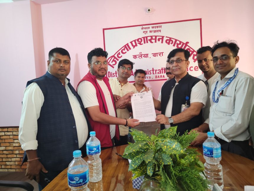 कलैया : प्रेस सेन्टर नेपाल,जिल्ला समन्वय समिति बाराले बाराका प्रमुख जिल्ला अधिकारी बासन्त अधिकारीमार्फत एक ज्ञापनपत्र बुझाएको छ।