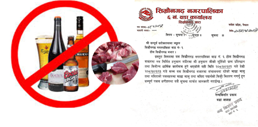 वडा अध्यक्ष नन्दकिशोर प्रसादले एक सार्वजनिक सूचना जारी गरी माछा मासु तथा मदिराको बिक्री बितरण नगर्न ब्यवसायीहरुलाई जानकारी गराएका हुन ।