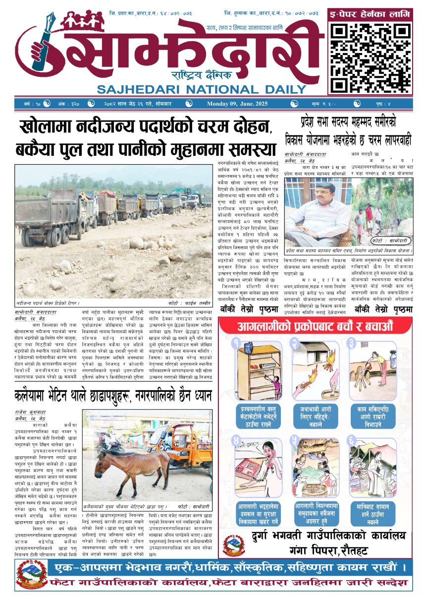ई–पेपर २०८२ जेठ २६ गते । साझेदारी दैनिक साझेदारी दैनिक २०८२ जेष्ठ २६, गते 312 पाठक संख्या शेयर शेयर Leave a review Leave a review Leave a Review Cancel replyYour email address will not be published. Required fields are marked * Please select a rating! Your Rating Rate… Perfect Good Average Not that Bad Very Poor Your Comment *नाम * Your Email * Your website Save my name, email, and website in this browser for the next time I comment. ताजा अपडेट पहिलेको निर्णय फेरियो : कलैयामा अब वैशाख १६ देखि कक्षा सुरु हुने मधेश मुख्य समाचार समाचार कलैयामा वैशाख १५ गतेदेखि भर्ना अभियान, २१ गतेदेखि पठनपाठन सुरु हुने मधेश मुख्य समाचार समाचार पेट्रोलियम पदार्थमा गरिएको मूल्य वृद्धि फिर्ता लिन अध्यक्ष घिसिङको माग समाचार पर्सा राष्ट्रिय निकुञ्जमा वन्यजन्तु उद्धार केन्द्र उद्घाटन मधेश समाचार कलैयामा खसी मासुको छालासहित र बिना छालाको छुट्टाछुट्टै मूल्य निर्धारण मधेश समाचार सिम्रौनगढमा छाडा कुकुरको आतंक : एकै घरका ८ खसी-बाख्रा मरे मधेश मुख्य समाचार समाचार २०८३ वैशाख ०७ गते । साझेदारी दैनिक ई–पेपर मुख्य समाचार रेल्वे सेवा ७९ करोड ऋणमा मधेश समाचार सडक विस्तारले वीरगञ्जको विद्युत् अवरुद्ध मधेश मुख्य समाचार समाचार बाईपास विस्तारका लागि २४ घण्टाभित्र संरचना हटाउन वीरगञ्ज महानगरको निर्देशन मधेश मुख्य समाचार समाचार वीरगञ्जमा भर्ना अभियान वैशाख ७ गतेदेखि सुरु हुने मधेश समाचार वीरगन्जमा अतिक्रमित संरचना भत्काउन सुरु मधेश मुख्य समाचार समाचार प्रदेश समाचार जीतपुरसिमराको बिद्यालयमा पठनपाठन वैशाख १४ गते देखि सुरु हुने मधेश मुख्य समाचार समाचार करैयामाई -६ सिहोर्वामा नि:शुल्क स्वास्थ्य शिविर सम्पन्न मधेश समाचार स्वास्थ्य बारामा खेतबाट घर फर्किँदै गर्दा चट्याङ लागेर एक जनाको मृत्यु मधेश मुख्य समाचार समाचार बृन्दावनमा ६ सुकुम्बासी परिवार विस्थापित मधेश समाचार सुनसरीमा काँचो केरासहित चार जना पक्राउ मधेश मुख्य समाचार समाचार