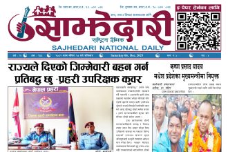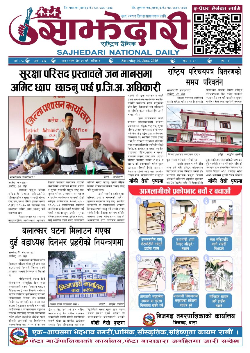 ई–पेपर २०८२ जेठ ३१ गते । साझेदारी दैनिक साझेदारी दैनिक २०८२ जेष्ठ ३१, गते 259 पाठक संख्या शेयर शेयर Leave a review Leave a review Leave a Review Cancel replyYour email address will not be published. Required fields are marked * Please select a rating! Your Rating Rate… Perfect Good Average Not that Bad Very Poor Your Comment *नाम * Your Email * Your website Save my name, email, and website in this browser for the next time I comment. ताजा अपडेट दुर्घटना न्यूनीकरणलाई केन्द्रमा राखेर काम गर्न डीआईजी थपलियाको निर्देशन मधेश मुख्य समाचार समाचार कलैयामा घरको ताला तोडेर करिब ५० लाख बराबरको चोरी मधेश मुख्य समाचार समाचार प्रधानमन्त्री कप क्रिकेटको उपाधि त्रिभुवन आर्मी क्लबलाई खेलकुद मधेश मुख्य समाचार समाचार लागुऔषधसहित विभिन्न स्थानबाट २४ जना पक्राउ प्रदेश समाचार समाचार सुनचाँदीको मूल्य घट्यो समाचार भन्सार छली प्रकरणः तीन जनाविरुद्ध अदालतमा मुद्दा, मुख्य अभियुक्तबाट २ करोडभन्दा बढी बिगो दाबी मधेश मुख्य समाचार समाचार जीतपुरको गौशाला जग्गा अतिक्रमण घरटहरा हटाइयो मधेश मुख्य समाचार समाचार मुख्य समाचार बारामा भूतपूर्व सैनिक पुनर्मिलन कार्यक्रम सम्पन्न मधेश समाचार पाँच पटक भन्दाबढी ट्राफिक नियम उल्लंघन गर्नेको लाइसेन्स निलम्बन प्रक्रिया सुरु मधेश मुख्य समाचार समाचार बाराका दुई नगरपालिकामा नयाँ प्रमुख प्रशासकीय अधिकृत खटाइए मधेश मुख्य समाचार समाचार पर्सामा नागरिकतासँगै राष्ट्रिय परिचयपत्र मधेश मुख्य समाचार समाचार राजश्व अनुसन्धान कार्यालय पथलैयामा आगलागी, प्रमुखको कार्यकक्ष ध्वस्त मधेश समाचार प्रदेश समाचार भाडा वृद्धि पछि सिमरा-काठमाडौं उडानमा यात्रु घटे मधेश मुख्य समाचार समाचार बारामा साढे दुई महिनामा एक करोडभन्दा बढीको अवैध सामान बरामद मधेश मुख्य समाचार समाचार सांसद साहलाई जीतपुरसिमरा-१७ का वडाबासीद्वारा ध्यानाकर्षणपत्र बुझाइयो मधेश मुख्य समाचार समाचार प्रधानमन्त्री कपको आजको खेलमा मधेस प्रदेश विजयी खेलकुद मधेश समाचार स्थानीय तहसँग मागियो विद्यालय समायोजनको विवरण प्रदेश समाचार समाचार