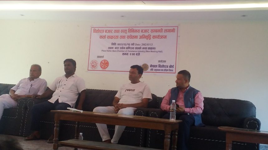 संविधान सभा सदस्य प्रमोद गुप्ताको प्रमुख आतिथ्यतामा बारा उद्योग वाणिज्य संघका अध्यक्ष राजकुमार साहको अध्यक्षतामा उतm कार्यक्रम सम्पन्न भएको हो। उक्त कार्यक्रममा धितो बोर्डका सहायक निर्देशक बिपिन ओझाले सञ्चालन तथा सहजीकरण गरेका थिए।