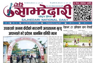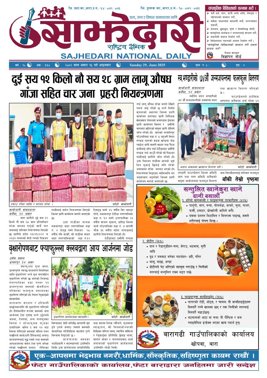 ई–पेपर २०८२ असार १५ गते । साझेदारी दैनिक साझेदारी दैनिक २०८२ असार १५, गते 203 पाठक संख्या शेयर शेयर Leave a review Leave a review Leave a Review Cancel replyYour email address will not be published. Required fields are marked * Please select a rating! Your Rating Rate… Perfect Good Average Not that Bad Very Poor Your Comment *नाम * Your Email * Your website Save my name, email, and website in this browser for the next time I comment. ताजा अपडेट दुर्घटना न्यूनीकरणलाई केन्द्रमा राखेर काम गर्न डीआईजी थपलियाको निर्देशन मधेश मुख्य समाचार समाचार कलैयामा घरको ताला तोडेर करिब ५० लाख बराबरको चोरी मधेश मुख्य समाचार समाचार प्रधानमन्त्री कप क्रिकेटको उपाधि त्रिभुवन आर्मी क्लबलाई खेलकुद मधेश मुख्य समाचार समाचार लागुऔषधसहित विभिन्न स्थानबाट २४ जना पक्राउ प्रदेश समाचार समाचार सुनचाँदीको मूल्य घट्यो समाचार भन्सार छली प्रकरणः तीन जनाविरुद्ध अदालतमा मुद्दा, मुख्य अभियुक्तबाट २ करोडभन्दा बढी बिगो दाबी मधेश मुख्य समाचार समाचार जीतपुरको गौशाला जग्गा अतिक्रमण घरटहरा हटाइयो मधेश मुख्य समाचार समाचार मुख्य समाचार बारामा भूतपूर्व सैनिक पुनर्मिलन कार्यक्रम सम्पन्न मधेश समाचार पाँच पटक भन्दाबढी ट्राफिक नियम उल्लंघन गर्नेको लाइसेन्स निलम्बन प्रक्रिया सुरु मधेश मुख्य समाचार समाचार बाराका दुई नगरपालिकामा नयाँ प्रमुख प्रशासकीय अधिकृत खटाइए मधेश मुख्य समाचार समाचार पर्सामा नागरिकतासँगै राष्ट्रिय परिचयपत्र मधेश मुख्य समाचार समाचार राजश्व अनुसन्धान कार्यालय पथलैयामा आगलागी, प्रमुखको कार्यकक्ष ध्वस्त मधेश समाचार प्रदेश समाचार भाडा वृद्धि पछि सिमरा-काठमाडौं उडानमा यात्रु घटे मधेश मुख्य समाचार समाचार बारामा साढे दुई महिनामा एक करोडभन्दा बढीको अवैध सामान बरामद मधेश मुख्य समाचार समाचार सांसद साहलाई जीतपुरसिमरा-१७ का वडाबासीद्वारा ध्यानाकर्षणपत्र बुझाइयो मधेश मुख्य समाचार समाचार प्रधानमन्त्री कपको आजको खेलमा मधेस प्रदेश विजयी खेलकुद मधेश समाचार स्थानीय तहसँग मागियो विद्यालय समायोजनको विवरण प्रदेश समाचार समाचार