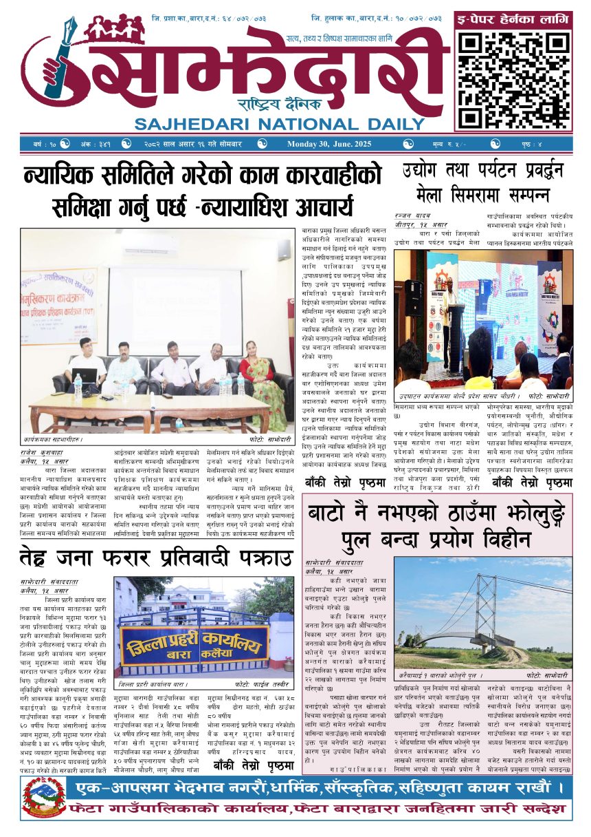 ई–पेपर २०८२ असार १६ गते । साझेदारी दैनिक साझेदारी दैनिक २०८२ असार १६, गते 354 पाठक संख्या शेयर शेयर Leave a review Leave a review Leave a Review Cancel replyYour email address will not be published. Required fields are marked * Please select a rating! Your Rating Rate… Perfect Good Average Not that Bad Very Poor Your Comment *नाम * Your Email * Your website Save my name, email, and website in this browser for the next time I comment. ताजा अपडेट कलैयामा घरको ताला तोडेर करिब ५० लाख बराबरको चोरी मधेश मुख्य समाचार समाचार प्रधानमन्त्री कप क्रिकेटको उपाधि त्रिभुवन आर्मी क्लबलाई खेलकुद मधेश मुख्य समाचार समाचार लागुऔषधसहित विभिन्न स्थानबाट २४ जना पक्राउ प्रदेश समाचार समाचार सुनचाँदीको मूल्य घट्यो समाचार भन्सार छली प्रकरणः तीन जनाविरुद्ध अदालतमा मुद्दा, मुख्य अभियुक्तबाट २ करोडभन्दा बढी बिगो दाबी मधेश मुख्य समाचार समाचार जीतपुरको गौशाला जग्गा अतिक्रमण घरटहरा हटाइयो मधेश मुख्य समाचार समाचार बारामा भूतपूर्व सैनिक पुनर्मिलन कार्यक्रम सम्पन्न मधेश समाचार मुख्य समाचार पाँच पटक भन्दाबढी ट्राफिक नियम उल्लंघन गर्नेको लाइसेन्स निलम्बन प्रक्रिया सुरु मधेश मुख्य समाचार समाचार बाराका दुई नगरपालिकामा नयाँ प्रमुख प्रशासकीय अधिकृत खटाइए मधेश मुख्य समाचार समाचार पर्सामा नागरिकतासँगै राष्ट्रिय परिचयपत्र मधेश मुख्य समाचार समाचार राजश्व अनुसन्धान कार्यालय पथलैयामा आगलागी, प्रमुखको कार्यकक्ष ध्वस्त मधेश समाचार भाडा वृद्धि पछि सिमरा-काठमाडौं उडानमा यात्रु घटे मधेश मुख्य समाचार समाचार प्रदेश समाचार बारामा साढे दुई महिनामा एक करोडभन्दा बढीको अवैध सामान बरामद मधेश मुख्य समाचार समाचार सांसद साहलाई जीतपुरसिमरा-१७ का वडाबासीद्वारा ध्यानाकर्षणपत्र बुझाइयो मधेश मुख्य समाचार समाचार प्रधानमन्त्री कपको आजको खेलमा मधेस प्रदेश विजयी खेलकुद मधेश समाचार स्थानीय तहसँग मागियो विद्यालय समायोजनको विवरण प्रदेश समाचार समाचार होटेल करण राज प्यालेसमा आधुनिक सुविधासहित स्विमिङ पुल उद्घाटन मधेश मुख्य समाचार समाचार