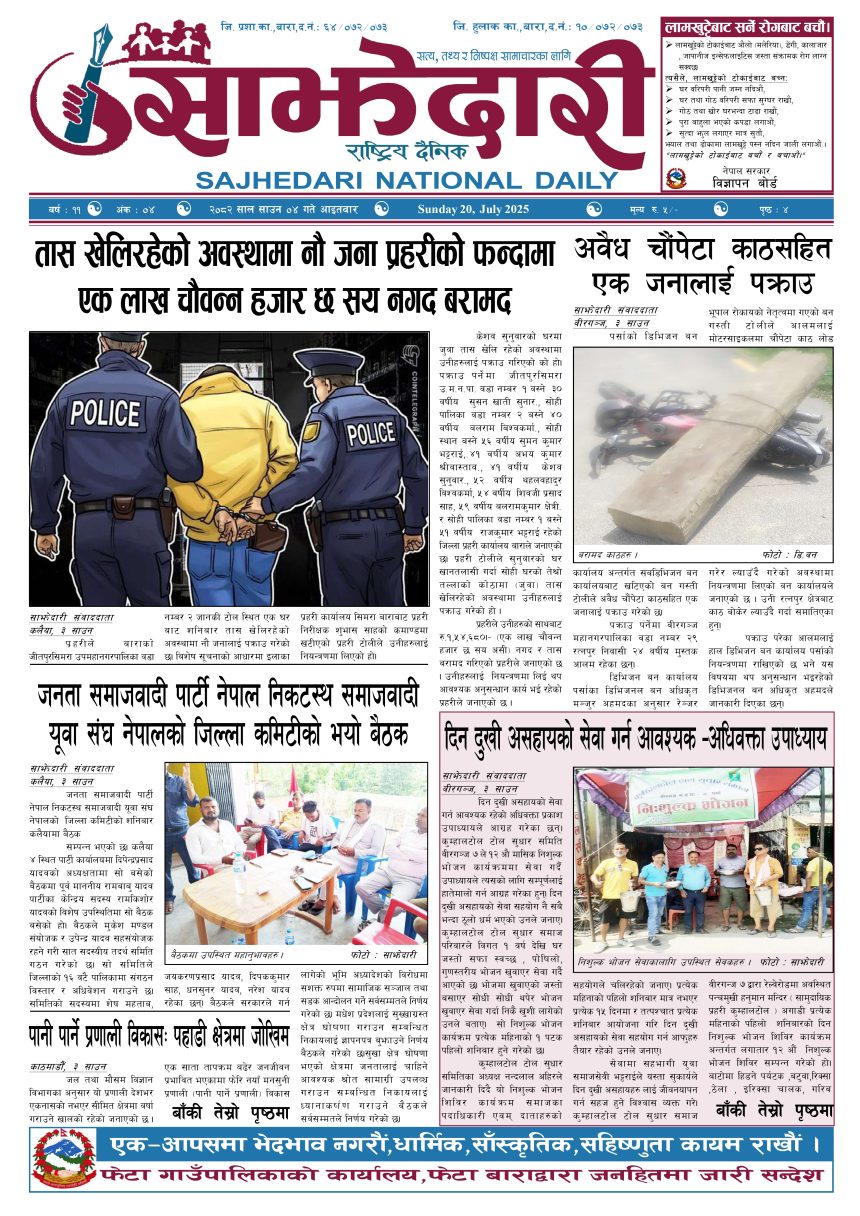 ई–पेपर २०८२ साउन ०४ गते । साझेदारी दैनिक साझेदारी दैनिक २०८२ श्रावण ४, गते 204 पाठक संख्या शेयर शेयर Leave a review Leave a review Leave a Review Cancel replyYour email address will not be published. Required fields are marked * Please select a rating! Your Rating Rate… Perfect Good Average Not that Bad Very Poor Your Comment *नाम * Your Email * Your website Save my name, email, and website in this browser for the next time I comment. ताजा अपडेट २०८३ वैशाख ०५ गते । साझेदारी दैनिक ई–पेपर दुर्घटना न्यूनीकरणलाई केन्द्रमा राखेर काम गर्न डीआईजी थपलियाको निर्देशन मधेश मुख्य समाचार समाचार कलैयामा घरको ताला तोडेर करिब ५० लाख बराबरको चोरी मधेश मुख्य समाचार समाचार प्रधानमन्त्री कप क्रिकेटको उपाधि त्रिभुवन आर्मी क्लबलाई खेलकुद मधेश मुख्य समाचार समाचार लागुऔषधसहित विभिन्न स्थानबाट २४ जना पक्राउ प्रदेश समाचार समाचार सुनचाँदीको मूल्य घट्यो समाचार भन्सार छली प्रकरणः तीन जनाविरुद्ध अदालतमा मुद्दा, मुख्य अभियुक्तबाट २ करोडभन्दा बढी बिगो दाबी मधेश मुख्य समाचार समाचार मुख्य समाचार जीतपुरको गौशाला जग्गा अतिक्रमण घरटहरा हटाइयो मधेश मुख्य समाचार समाचार बारामा भूतपूर्व सैनिक पुनर्मिलन कार्यक्रम सम्पन्न मधेश समाचार पाँच पटक भन्दाबढी ट्राफिक नियम उल्लंघन गर्नेको लाइसेन्स निलम्बन प्रक्रिया सुरु मधेश मुख्य समाचार समाचार बाराका दुई नगरपालिकामा नयाँ प्रमुख प्रशासकीय अधिकृत खटाइए मधेश मुख्य समाचार समाचार पर्सामा नागरिकतासँगै राष्ट्रिय परिचयपत्र मधेश मुख्य समाचार समाचार प्रदेश समाचार राजश्व अनुसन्धान कार्यालय पथलैयामा आगलागी, प्रमुखको कार्यकक्ष ध्वस्त मधेश समाचार भाडा वृद्धि पछि सिमरा-काठमाडौं उडानमा यात्रु घटे मधेश मुख्य समाचार समाचार बारामा साढे दुई महिनामा एक करोडभन्दा बढीको अवैध सामान बरामद मधेश मुख्य समाचार समाचार सांसद साहलाई जीतपुरसिमरा-१७ का वडाबासीद्वारा ध्यानाकर्षणपत्र बुझाइयो मधेश मुख्य समाचार समाचार प्रधानमन्त्री कपको आजको खेलमा मधेस प्रदेश विजयी खेलकुद मधेश समाचार