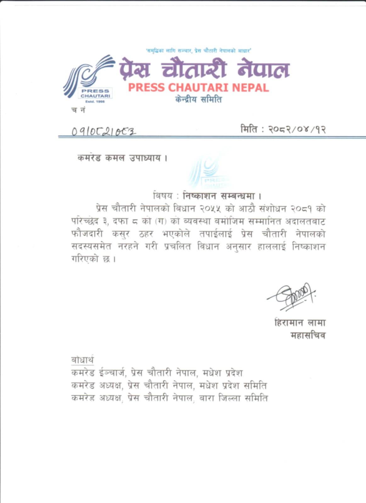 काठमाडाैं ।  फौजदारी अपराधमा विशेष अदालतबाट दोषी ठहरिएपछि मधेश प्रदेश प्रेस काउन्सिलका अध्यक्ष कमलकुमार उपाध्यायलाई प्रेस चौतारी नेपालले संगठनबाट निष्काशन गरेको छ।