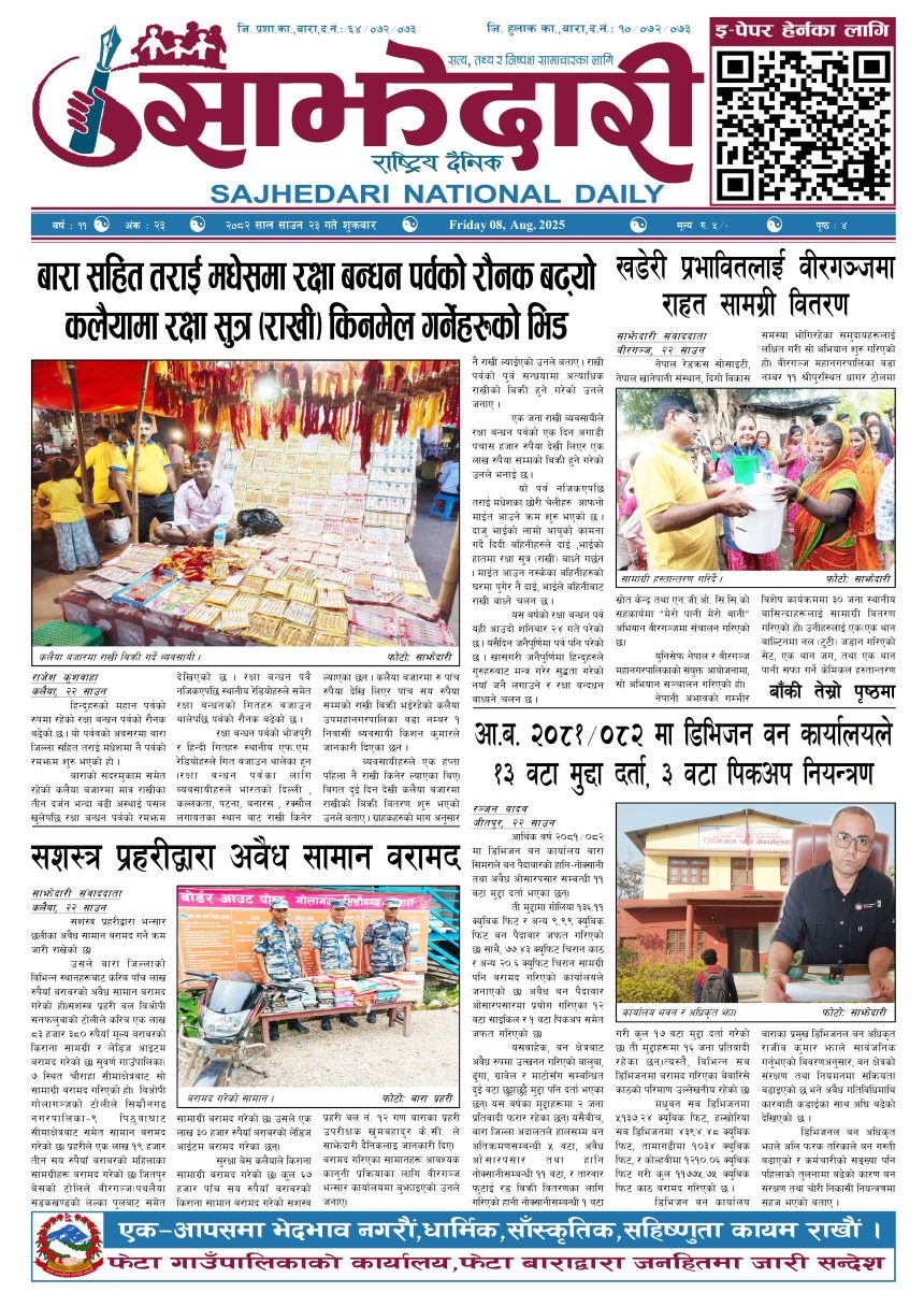 ई–पेपर २०८२ साउन २३ गते । साझेदारी दैनिक साझेदारी दैनिक २०८२ श्रावण २३, गते 234 पाठक संख्या शेयर शेयर Leave a review Leave a review Leave a Review Cancel replyYour email address will not be published. Required fields are marked * Please select a rating! Your Rating Rate… Perfect Good Average Not that Bad Very Poor Your Comment *नाम * Your Email * Your website Save my name, email, and website in this browser for the next time I comment. ताजा अपडेट २०८३ वैशाख १४ गते । साझेदारी दैनिक ई–पेपर रौतहटमा गुणस्तरहीन निर्माण कार्य भएको भन्दै स्थानीयद्वारा विरोध ,काका ठेकेदार भतिजा ईन्जिनियर मधेश मुख्य समाचार समाचार गण्डक नहर किनारका अतिक्रमित संरचना हटाउन थालियो मधेश समाचार कलैया : बसपार्कबाटै सवारी चलाउने निर्णय अझै कार्यान्वयन भएन मधेश मुख्य समाचार समाचार सुनचाँदीको मुल्य आज बढ्यो समाचार मनोहरा सुकुमवासी बस्तीमा घरटहरा भत्काउन सुरु समाचार खुला नाकाबाट सोझै वीरगन्ज भित्रिन्छ भारतीय तरकारी मधेश समाचार मुख्य समाचार मधुवनमा काठसहित एक जना पक्राउ मधेश समाचार सेज क्षेत्रको अतिक्रमण हटाउने प्रक्रिया तीव्र हुँदै,५ सय बिघा जमिन फिर्ता लिन सरकारको दबाब मधेश मुख्य समाचार समाचार कलवारको नेतृत्वमा शान्ति युवा मञ्चको नयाँ समिति गठन मधेश समाचार अत्याधिक गर्मीलाई मध्यनजर गर्दै कलैयामा निःशुल्क पानी र शरबत वितरण मधेश समाचार कलैयामा अब सबै रुटका सवारी बसपार्कबाट मात्र सञ्चालन हुने मधेश मुख्य समाचार समाचार प्रदेश समाचार बिजुली, पानी र विवाह रकम भुक्तानीको माग गर्दै मौलापुर नगरपालिकाविरुद्ध आन्दोलन घोषणा मधेश समाचार थापाथलीको सुकुमबासी बस्ती खाली गरियो बागमती समाचार वीरगञ्जबाट पेट्रोलियम आयात, साठी अर्ब अठतीस करोड राजस्व सङ्कलन मधेश समाचार पथलैयामा ओभरलोड सवारीमाथि एक्सनः दुई दिनमै ६ गाडी कारवाहीमा मधेश मुख्य समाचार समाचार सुकुम्वासी मोर्चाका कार्यवाहक अध्यक्ष परियार पक्राउ बागमती समाचार