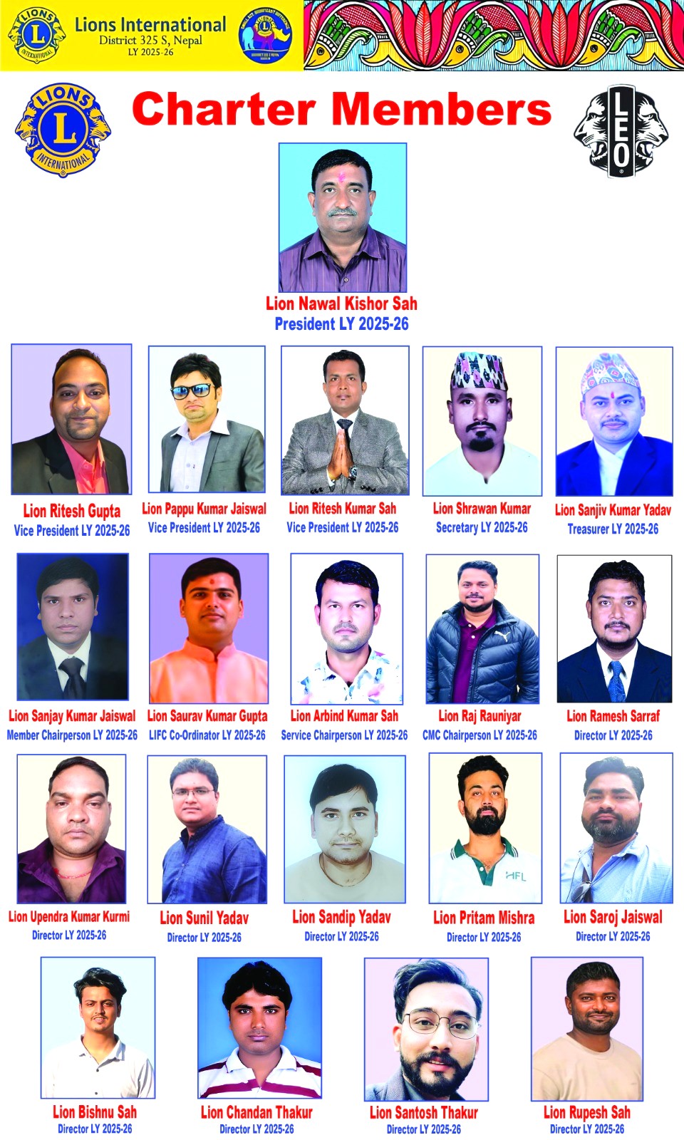 त्यसैगरी सदस्य चेयरपर्सन संजय जैसवाल, एलआईएफसी कोअर्डिनेटर सौरभ कुमार गुप्ता, सर्भिस चेयरपर्सन अर्बिन्द कुमार साह, सिएमसि चेयरपर्सन राज रौनियार, साथै डाइरेक्टरमा रमेश सर्राफ, उपेन्द्र कुमार कुर्मी, सुनिल यादव, सन्दिप यादव, पृतम मिश्र, सरोज जैसवाल, बिष्णु साह, चन्दन ठाकुर, सन्तोष ठाकुर र रुपेश साह चयन भएका छन् ।