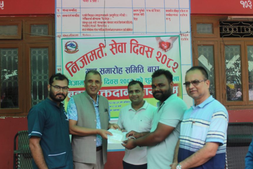नेपाल सेवा दिवस मूल समारोह समिति बाराको आयोजना र नेपाल निजामति कर्मचारी संगठन जिल्ला कार्य समिति बाराको सहयोगमा जिल्ला प्रशासन कार्यालय बाराको प्राङ्गणमा उक्त बृहत रक्तदान कार्यक्रम सम्पन्न भएको हो।
