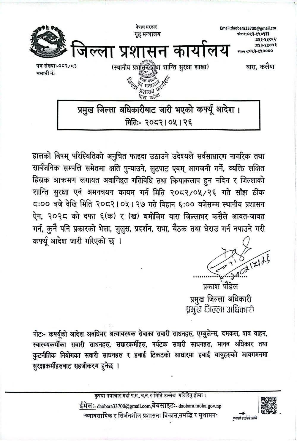 बारा जिल्लाभर कसैले आवत–जावत गर्न, कुनै पनि प्रकारको भेला, जुलुस, प्रदर्शन, सभा, बैठक तथा घेराउ गर्न नपाउने गरी कफ्र्यू आदेश जारी गरिएको छ ।