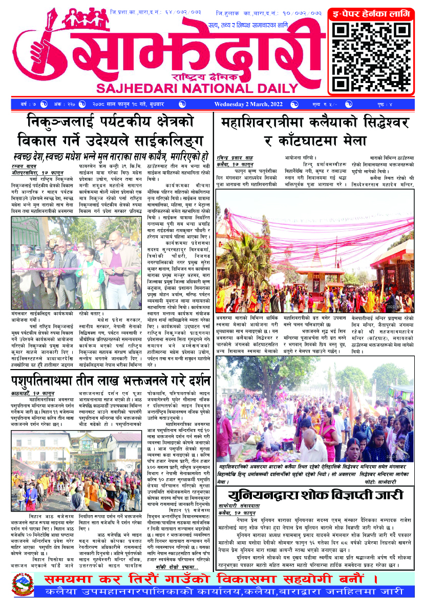 ई–पेपर २०८२ असोज ०१ गते । साझेदारी दैनिक साझेदारी दैनिक २०८२ आश्विन १, गते 152 पाठक संख्या शेयर शेयर Leave a review Leave a review Leave a Review Cancel replyYour email address will not be published. Required fields are marked * Please select a rating! Your Rating Rate… Perfect Good Average Not that Bad Very Poor Your Comment *नाम * Your Email * Your website Save my name, email, and website in this browser for the next time I comment. ताजा अपडेट कलैयाका व्यवसायीमाथि नगर प्रहरीको बर्बरता: पसलभित्रै छिरेर व्यवसायीलाई लछारपछार मधेश मुख्य समाचार समाचार आमामाथि कुटपिट गरी भाग्दै गरेका युवक अफिमसहित पक्राउ मधेश समाचार पर्सामा ३० हजार ट्रामाडोल ट्याब्लेटसहित भारतीय नागरिक पक्राउ मधेश समाचार तेइस लाख बालकालिकालाई भिटामिन ‘ए’ खुवाइयो समाचार स्वास्थ्य पर्सामा लागूऔषध गाँजा जस्तो पदार्थसहित चार भारतीय नागरिक पक्राउ मधेश समाचार चक्कु प्रहार गरी युवकको हत्या समाचार बनावटी अडियो काण्ड : प्रहरी वरिष्ठ नायव निरीक्षक सागर शमसेर ज.ब.रा. निलम्बन प्रक्रियामा मधेश मुख्य समाचार समाचार मुख्य समाचार १९ औं स्थापना दिवसको अवसरमा ३७ जनाद्वारा रक्तदान मधेश समाचार वीरगञ्ज भन्सारद्वारा नौ महिनामा एक खर्ब ७७ करोड राजस्व सङ्कलन मधेश समाचार व्यवसाय सञ्चालनमा पारदर्शिता र नियम पालना गर्न जीतपुरसिमरा उद्योग वाणिज्य संघको आग्रह मधेश समाचार पथलैया-चुरियामाई सडक क्षेत्रका संरचना हटाउन ३ दिनको अल्टिमेटम मधेश मुख्य समाचार समाचार सिमरामा ‘केआईईसी’को नयाँ शाखा सञ्चालन,विदेश अध्ययन चाहने विद्यार्थीलाई सहज मधेश मुख्य समाचार समाचार प्रदेश समाचार पहिलेको निर्णय फेरियो : कलैयामा अब वैशाख १६ देखि कक्षा सुरु हुने मधेश मुख्य समाचार समाचार कलैयामा वैशाख १५ गतेदेखि भर्ना अभियान, २१ गतेदेखि पठनपाठन सुरु हुने मधेश मुख्य समाचार समाचार पर्सा राष्ट्रिय निकुञ्जमा वन्यजन्तु उद्धार केन्द्र उद्घाटन मधेश समाचार कलैयामा खसी मासुको छालासहित र बिना छालाको छुट्टाछुट्टै मूल्य निर्धारण मधेश समाचार सिम्रौनगढमा छाडा कुकुरको आतंक : एकै घरका ८ खसी-बाख्रा मरे मधेश मुख्य समाचार समाचार
