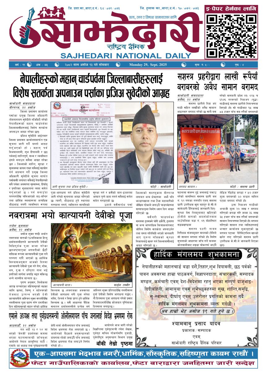 ई–पेपर २०८२ असोज १३ गते । साझेदारी दैनिक साझेदारी दैनिक २०८२ आश्विन १३, गते 233 पाठक संख्या शेयर शेयर Leave a review Leave a review Leave a Review Cancel replyYour email address will not be published. Required fields are marked * Please select a rating! Your Rating Rate… Perfect Good Average Not that Bad Very Poor Your Comment *नाम * Your Email * Your website Save my name, email, and website in this browser for the next time I comment. ताजा अपडेट २०८३ वैशाख ०५ गते । साझेदारी दैनिक ई–पेपर दुर्घटना न्यूनीकरणलाई केन्द्रमा राखेर काम गर्न डीआईजी थपलियाको निर्देशन मधेश मुख्य समाचार समाचार कलैयामा घरको ताला तोडेर करिब ५० लाख बराबरको चोरी मधेश मुख्य समाचार समाचार प्रधानमन्त्री कप क्रिकेटको उपाधि त्रिभुवन आर्मी क्लबलाई खेलकुद मधेश मुख्य समाचार समाचार लागुऔषधसहित विभिन्न स्थानबाट २४ जना पक्राउ प्रदेश समाचार समाचार सुनचाँदीको मूल्य घट्यो समाचार भन्सार छली प्रकरणः तीन जनाविरुद्ध अदालतमा मुद्दा, मुख्य अभियुक्तबाट २ करोडभन्दा बढी बिगो दाबी मधेश मुख्य समाचार समाचार मुख्य समाचार जीतपुरको गौशाला जग्गा अतिक्रमण घरटहरा हटाइयो मधेश मुख्य समाचार समाचार बारामा भूतपूर्व सैनिक पुनर्मिलन कार्यक्रम सम्पन्न मधेश समाचार पाँच पटक भन्दाबढी ट्राफिक नियम उल्लंघन गर्नेको लाइसेन्स निलम्बन प्रक्रिया सुरु मधेश मुख्य समाचार समाचार बाराका दुई नगरपालिकामा नयाँ प्रमुख प्रशासकीय अधिकृत खटाइए मधेश मुख्य समाचार समाचार पर्सामा नागरिकतासँगै राष्ट्रिय परिचयपत्र मधेश मुख्य समाचार समाचार प्रदेश समाचार राजश्व अनुसन्धान कार्यालय पथलैयामा आगलागी, प्रमुखको कार्यकक्ष ध्वस्त मधेश समाचार भाडा वृद्धि पछि सिमरा-काठमाडौं उडानमा यात्रु घटे मधेश मुख्य समाचार समाचार बारामा साढे दुई महिनामा एक करोडभन्दा बढीको अवैध सामान बरामद मधेश मुख्य समाचार समाचार सांसद साहलाई जीतपुरसिमरा-१७ का वडाबासीद्वारा ध्यानाकर्षणपत्र बुझाइयो मधेश मुख्य समाचार समाचार प्रधानमन्त्री कपको आजको खेलमा मधेस प्रदेश विजयी खेलकुद मधेश समाचार