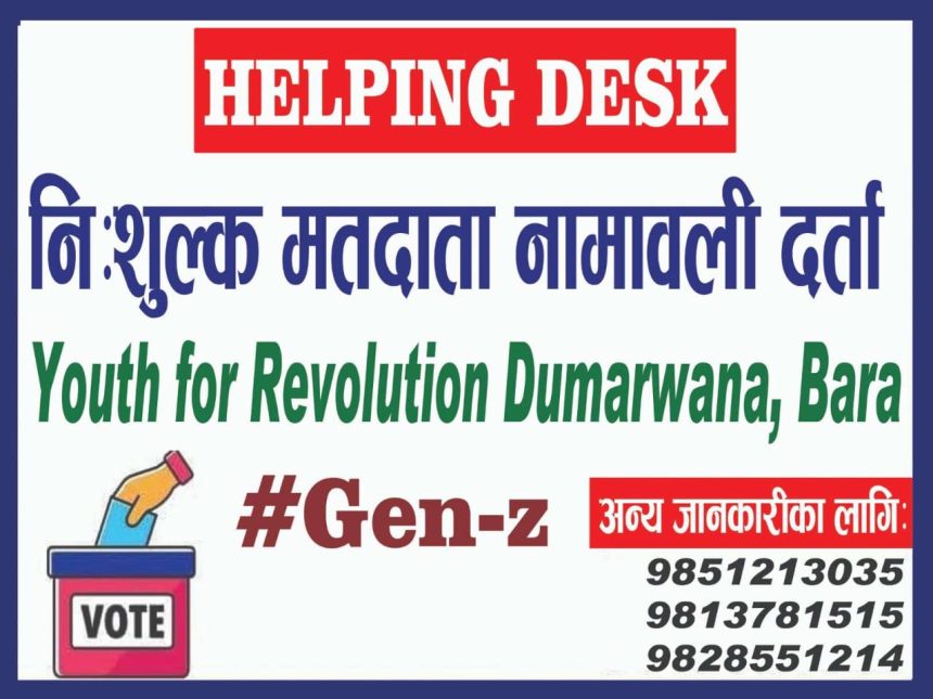 गत भदौ २३ र २४ गतेको परिवर्तनकारी आन्दोलनबाट बनेको अन्तरिम सरकारले फाल्गुन २१ गते हुने संसदीय निर्वाचनमा युवाहरू उत्साहका साथ सहभागिताको लागि नयाँ मतदाताहरूको सहजीकरणका लागि डुमरवाना चोकमा सहायता कक्षनै स्थापना गरेर बसेका छन । युवा मतदाता आगामी फागुन २१ गतेको संसदीय निर्वाचनका लागि मतदाता नामावलीमा नाम दर्ता गर्न उत्साहित देखिएका छन्। हालैका प्रदर्शनबाट प्रेरित भएर उनीहरूले आफ्नो मताधिकार सुनिश्चित गर्न चाहेका छन् ।