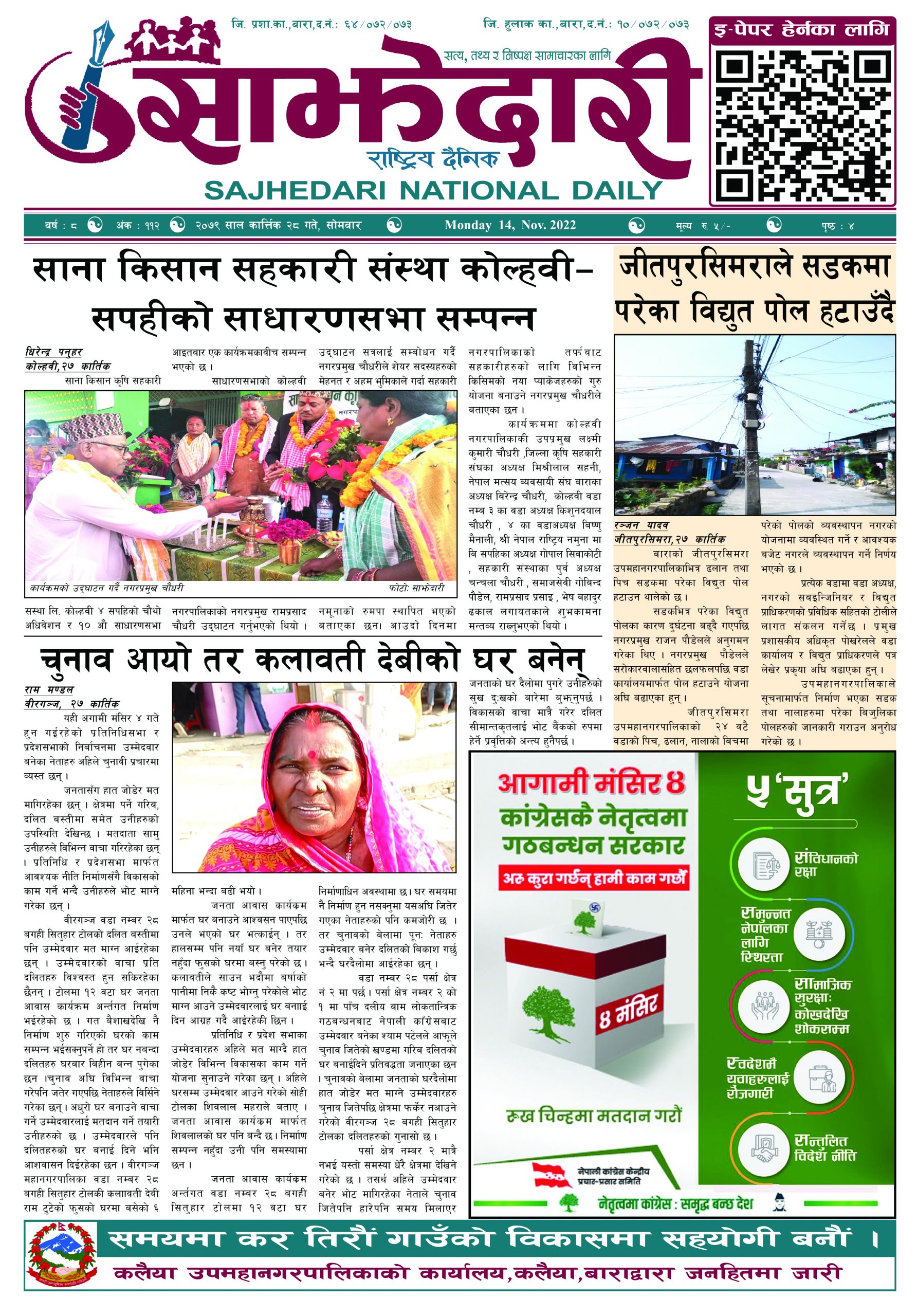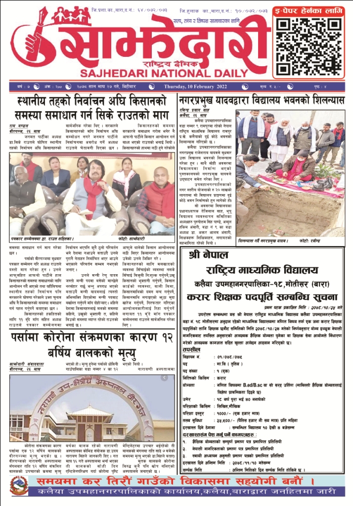 ई–पेपर २०८२ कार्तिक ०२ गते । साझेदारी दैनिक साझेदारी दैनिक २०८२ कार्तिक २, गते 358 पाठक संख्या शेयर शेयर Leave a review Leave a review Leave a Review Cancel replyYour email address will not be published. Required fields are marked * Please select a rating! Your Rating Rate… Perfect Good Average Not that Bad Very Poor Your Comment *नाम * Your Email * Your website Save my name, email, and website in this browser for the next time I comment. ताजा अपडेट सडक विस्तारले वीरगञ्जको विद्युत् अवरुद्ध मधेश मुख्य समाचार समाचार बाईपास विस्तारका लागि २४ घण्टाभित्र संरचना हटाउन वीरगञ्ज महानगरको निर्देशन मधेश मुख्य समाचार समाचार वीरगञ्जमा भर्ना अभियान वैशाख ७ गतेदेखि सुरु हुने मधेश समाचार वीरगन्जमा अतिक्रमित संरचना भत्काउन सुरु मधेश मुख्य समाचार समाचार जीतपुरसिमराको बिद्यालयमा पठनपाठन वैशाख १४ गते देखि सुरु हुने मधेश मुख्य समाचार समाचार २०८३ वैशाख ०६ गते । साझेदारी दैनिक ई–पेपर करैयामाई -६ सिहोर्वामा नि:शुल्क स्वास्थ्य शिविर सम्पन्न मधेश समाचार स्वास्थ्य मुख्य समाचार बारामा खेतबाट घर फर्किँदै गर्दा चट्याङ लागेर एक जनाको मृत्यु मधेश मुख्य समाचार समाचार बृन्दावनमा ६ सुकुम्बासी परिवार विस्थापित मधेश समाचार सुनसरीमा काँचो केरासहित चार जना पक्राउ मधेश मुख्य समाचार समाचार दुर्घटना न्यूनीकरणलाई केन्द्रमा राखेर काम गर्न डीआईजी थपलियाको निर्देशन मधेश मुख्य समाचार समाचार कलैयामा घरको ताला तोडेर करिब ५० लाख बराबरको चोरी मधेश मुख्य समाचार समाचार प्रदेश समाचार प्रधानमन्त्री कप क्रिकेटको उपाधि त्रिभुवन आर्मी क्लबलाई खेलकुद मधेश मुख्य समाचार समाचार लागुऔषधसहित विभिन्न स्थानबाट २४ जना पक्राउ प्रदेश समाचार समाचार भन्सार छली प्रकरणः तीन जनाविरुद्ध अदालतमा मुद्दा, मुख्य अभियुक्तबाट २ करोडभन्दा बढी बिगो दाबी मधेश मुख्य समाचार समाचार जीतपुरको गौशाला जग्गा अतिक्रमण घरटहरा हटाइयो मधेश मुख्य समाचार समाचार बारामा भूतपूर्व सैनिक पुनर्मिलन कार्यक्रम सम्पन्न मधेश समाचार