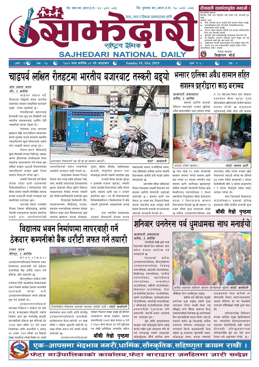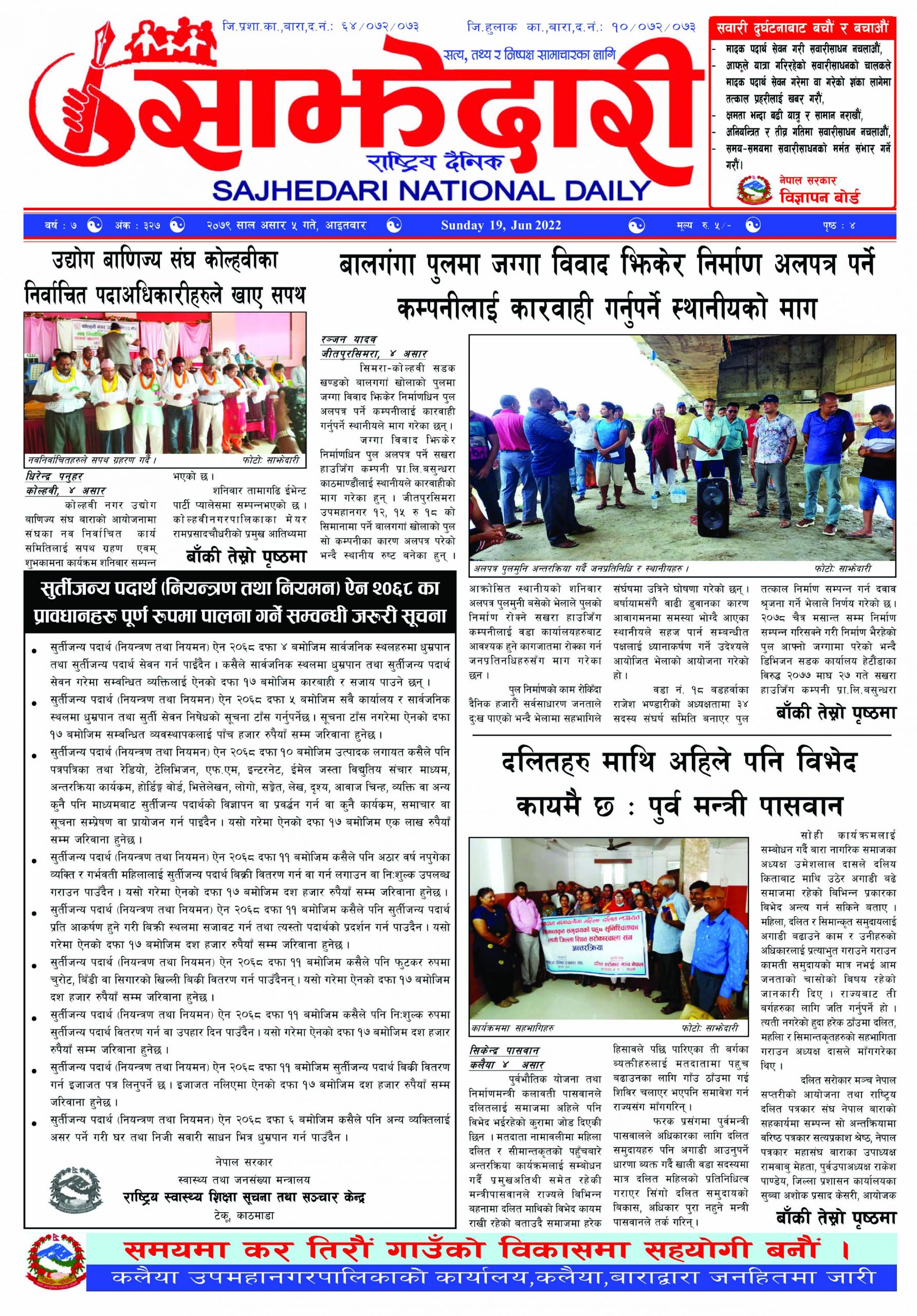 ई–पेपर २०८२ कार्तिक ०२ गते । साझेदारी दैनिक साझेदारी दैनिक २०८२ कार्तिक २, गते 189 पाठक संख्या शेयर Leave a review Leave a review Leave a Review Cancel replyYour email address will not be published. Required fields are marked * Please select a rating! Your Rating Rate… Perfect Good Average Not that Bad Very Poor Your Comment *नाम * Your Email * Your website Save my name, email, and website in this browser for the next time I comment. ताजा अपडेट छठ पर्वको तेस्रो दिन आज अस्ताउदो सूर्यलाई दिइयो अर्घ्य समाचार मधेश प्रदेशका मुख्यमन्त्री सोनलद्वारा छठ पर्वको शुभकामना मधेश समाचार छठ पर्वको मुख्य दिन : ब्रतालुहरू आज साँझ अस्ताउँदो सूर्यलाई अर्घ्य दिइदै मधेश मुख्य समाचार समाचार निर्वाचनलाई सफल बनाउन प्रधानमन्त्रीको आह्वान समाचार छठको तेस्रोदिन आज ‘सझुका अरख’ मधेश समाचार छठ पर्वमा दलितमाथि जातीय विभेद,सिमरामा दलित अगुवाहरूको कडा आपत्ति मधेश मुख्य समाचार समाचार २०८२ कार्तिक १० गते । साझेदारी दैनिक ई–पेपर मुख्य समाचार छठीसहित इष्टदेवलाई पूजाआराधना गरी खरना विधि सम्पन्न मधेश समाचार छठ पर्वमा भक्तजनलाई लक्षित गरी सेनाद्वारा बारामा नि:शुल्क हेल्थ डेस्क सञ्चालन गरिने मधेश मुख्य समाचार समाचार बाराका सिडिओ पौडेलको सरुवा,धरेन्द्र कुमार मिश्र आउदै मधेश मुख्य समाचार समाचार पर्सामा छठघाट सजाइयो मधेश मुख्य समाचार समाचार दाजुबहिनीको प्रेम प्रतीकको रुपमा रहेको समाचकेवा पर्व सुरु मधेश मुख्य समाचार समाचार प्रदेश समाचार छठको दोस्रो दिन आज ‘खरना’ मधेश समाचार वीरगञ्ज समाज सेवाद्वारा नारायणी अस्पतालमा निशुल्क भोजन प्रदान मधेश समाचार नकआउट फुटबल प्रतियोगिताको उपाधि रौतहट बनबहुअरीको पोल्टामा खेलकुद मधेश समाचार कलैयामा आतंक मच्चाउने बहुला कुकुरलाई बारा प्रहरीले लियो नियन्त्रणमा मधेश मुख्य समाचार समाचार छठ पर्वअन्तर्गत पहिलो दिन नहाय खाय विधि सम्पन्न मधेश समाचार
