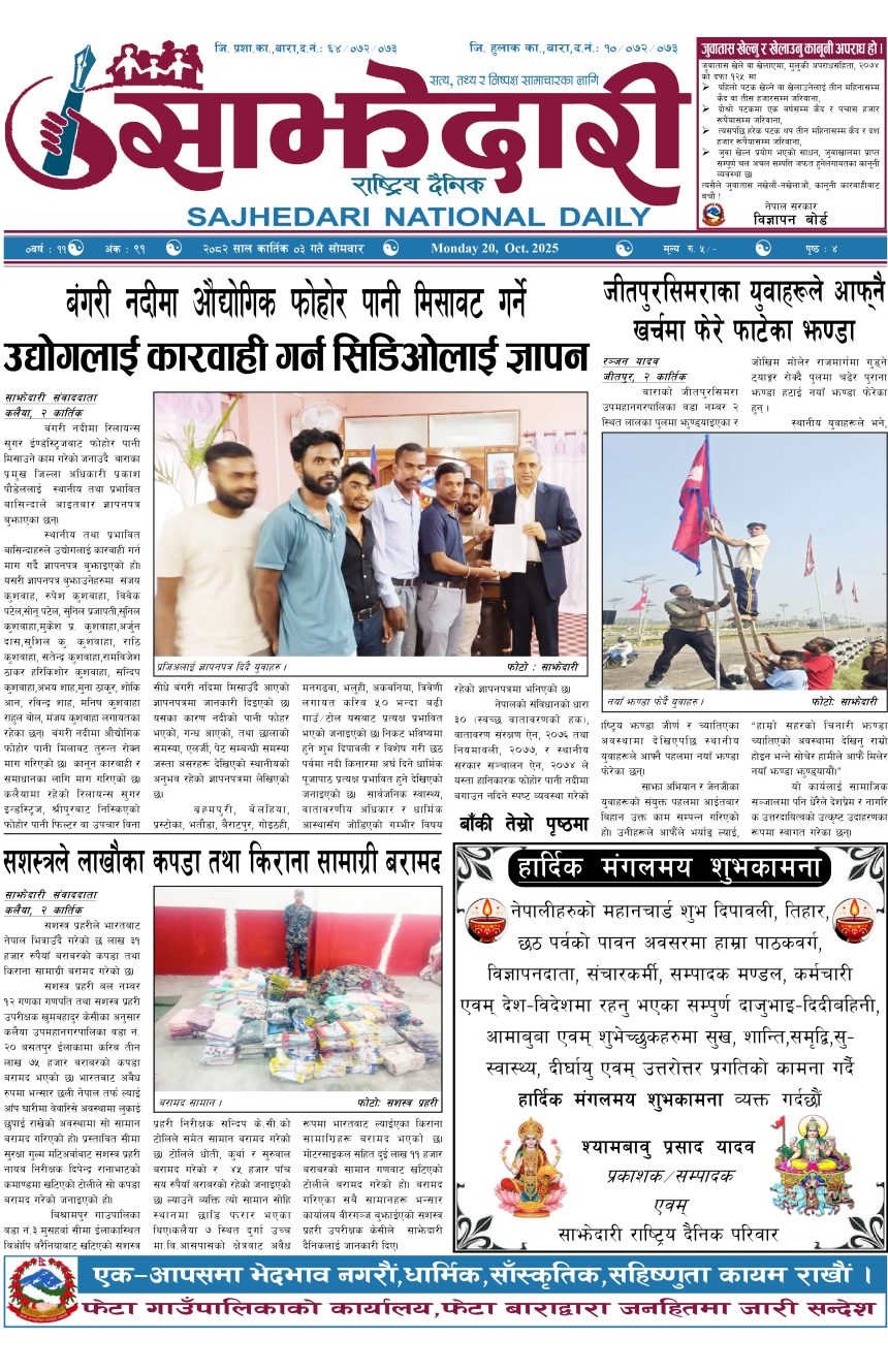 ई–पेपर २०८२ कार्तिक ०६ गते । साझेदारी दैनिक साझेदारी दैनिक २०८२ कार्तिक ६, गते 42 पाठक संख्या शेयर Leave a review Leave a review Leave a Review Cancel replyYour email address will not be published. Required fields are marked * Please select a rating! Your Rating Rate… Perfect Good Average Not that Bad Very Poor Your Comment *नाम * Your Email * Your website Save my name, email, and website in this browser for the next time I comment. ताजा अपडेट छठ पर्वको तेस्रो दिन आज अस्ताउदो सूर्यलाई दिइयो अर्घ्य समाचार मधेश प्रदेशका मुख्यमन्त्री सोनलद्वारा छठ पर्वको शुभकामना मधेश समाचार छठ पर्वको मुख्य दिन : ब्रतालुहरू आज साँझ अस्ताउँदो सूर्यलाई अर्घ्य दिइदै मधेश मुख्य समाचार समाचार निर्वाचनलाई सफल बनाउन प्रधानमन्त्रीको आह्वान समाचार छठको तेस्रोदिन आज ‘सझुका अरख’ मधेश समाचार छठ पर्वमा दलितमाथि जातीय विभेद,सिमरामा दलित अगुवाहरूको कडा आपत्ति मधेश मुख्य समाचार समाचार २०८२ कार्तिक १० गते । साझेदारी दैनिक ई–पेपर मुख्य समाचार छठीसहित इष्टदेवलाई पूजाआराधना गरी खरना विधि सम्पन्न मधेश समाचार छठ पर्वमा भक्तजनलाई लक्षित गरी सेनाद्वारा बारामा नि:शुल्क हेल्थ डेस्क सञ्चालन गरिने मधेश मुख्य समाचार समाचार बाराका सिडिओ पौडेलको सरुवा,धरेन्द्र कुमार मिश्र आउदै मधेश मुख्य समाचार समाचार पर्सामा छठघाट सजाइयो मधेश मुख्य समाचार समाचार दाजुबहिनीको प्रेम प्रतीकको रुपमा रहेको समाचकेवा पर्व सुरु मधेश मुख्य समाचार समाचार प्रदेश समाचार छठको दोस्रो दिन आज ‘खरना’ मधेश समाचार वीरगञ्ज समाज सेवाद्वारा नारायणी अस्पतालमा निशुल्क भोजन प्रदान मधेश समाचार नकआउट फुटबल प्रतियोगिताको उपाधि रौतहट बनबहुअरीको पोल्टामा खेलकुद मधेश समाचार कलैयामा आतंक मच्चाउने बहुला कुकुरलाई बारा प्रहरीले लियो नियन्त्रणमा मधेश मुख्य समाचार समाचार छठ पर्वअन्तर्गत पहिलो दिन नहाय खाय विधि सम्पन्न मधेश समाचार