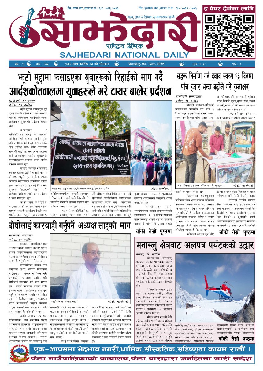 ई–पेपर २०८२ कार्तिक १७ गते । साझेदारी दैनिक साझेदारी दैनिक २०८२ कार्तिक १७, गते 225 पाठक संख्या शेयर शेयर Leave a review Leave a review Leave a Review Cancel replyYour email address will not be published. Required fields are marked * Please select a rating! Your Rating Rate… Perfect Good Average Not that Bad Very Poor Your Comment *नाम * Your Email * Your website Save my name, email, and website in this browser for the next time I comment. ताजा अपडेट दुर्घटना न्यूनीकरणलाई केन्द्रमा राखेर काम गर्न डीआईजी थपलियाको निर्देशन मधेश मुख्य समाचार समाचार कलैयामा घरको ताला तोडेर करिब ५० लाख बराबरको चोरी मधेश मुख्य समाचार समाचार प्रधानमन्त्री कप क्रिकेटको उपाधि त्रिभुवन आर्मी क्लबलाई खेलकुद मधेश मुख्य समाचार समाचार लागुऔषधसहित विभिन्न स्थानबाट २४ जना पक्राउ प्रदेश समाचार समाचार सुनचाँदीको मूल्य घट्यो समाचार भन्सार छली प्रकरणः तीन जनाविरुद्ध अदालतमा मुद्दा, मुख्य अभियुक्तबाट २ करोडभन्दा बढी बिगो दाबी मधेश मुख्य समाचार समाचार जीतपुरको गौशाला जग्गा अतिक्रमण घरटहरा हटाइयो मधेश मुख्य समाचार समाचार मुख्य समाचार बारामा भूतपूर्व सैनिक पुनर्मिलन कार्यक्रम सम्पन्न मधेश समाचार पाँच पटक भन्दाबढी ट्राफिक नियम उल्लंघन गर्नेको लाइसेन्स निलम्बन प्रक्रिया सुरु मधेश मुख्य समाचार समाचार बाराका दुई नगरपालिकामा नयाँ प्रमुख प्रशासकीय अधिकृत खटाइए मधेश मुख्य समाचार समाचार पर्सामा नागरिकतासँगै राष्ट्रिय परिचयपत्र मधेश मुख्य समाचार समाचार राजश्व अनुसन्धान कार्यालय पथलैयामा आगलागी, प्रमुखको कार्यकक्ष ध्वस्त मधेश समाचार प्रदेश समाचार भाडा वृद्धि पछि सिमरा-काठमाडौं उडानमा यात्रु घटे मधेश मुख्य समाचार समाचार बारामा साढे दुई महिनामा एक करोडभन्दा बढीको अवैध सामान बरामद मधेश मुख्य समाचार समाचार सांसद साहलाई जीतपुरसिमरा-१७ का वडाबासीद्वारा ध्यानाकर्षणपत्र बुझाइयो मधेश मुख्य समाचार समाचार प्रधानमन्त्री कपको आजको खेलमा मधेस प्रदेश विजयी खेलकुद मधेश समाचार स्थानीय तहसँग मागियो विद्यालय समायोजनको विवरण प्रदेश समाचार समाचार