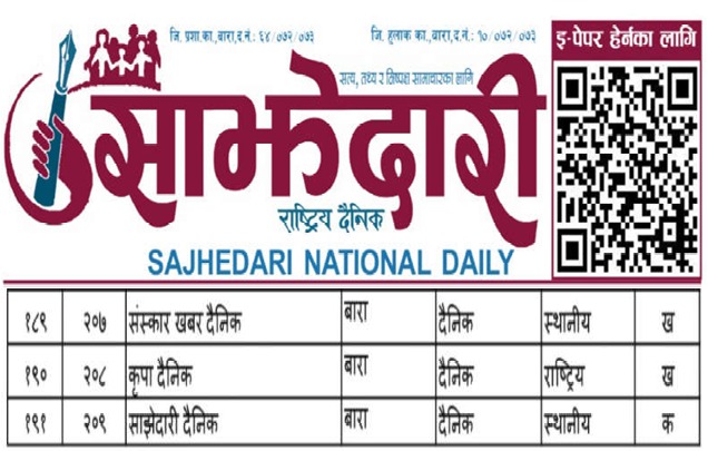 बाराबाट प्रकाशित ‘साझेदारी राष्ट्रिय दैनिक’ फेरि पनि प्रेस काउन्सिलको ‘क’ वर्गमा