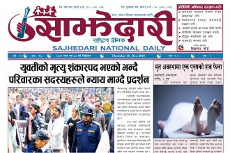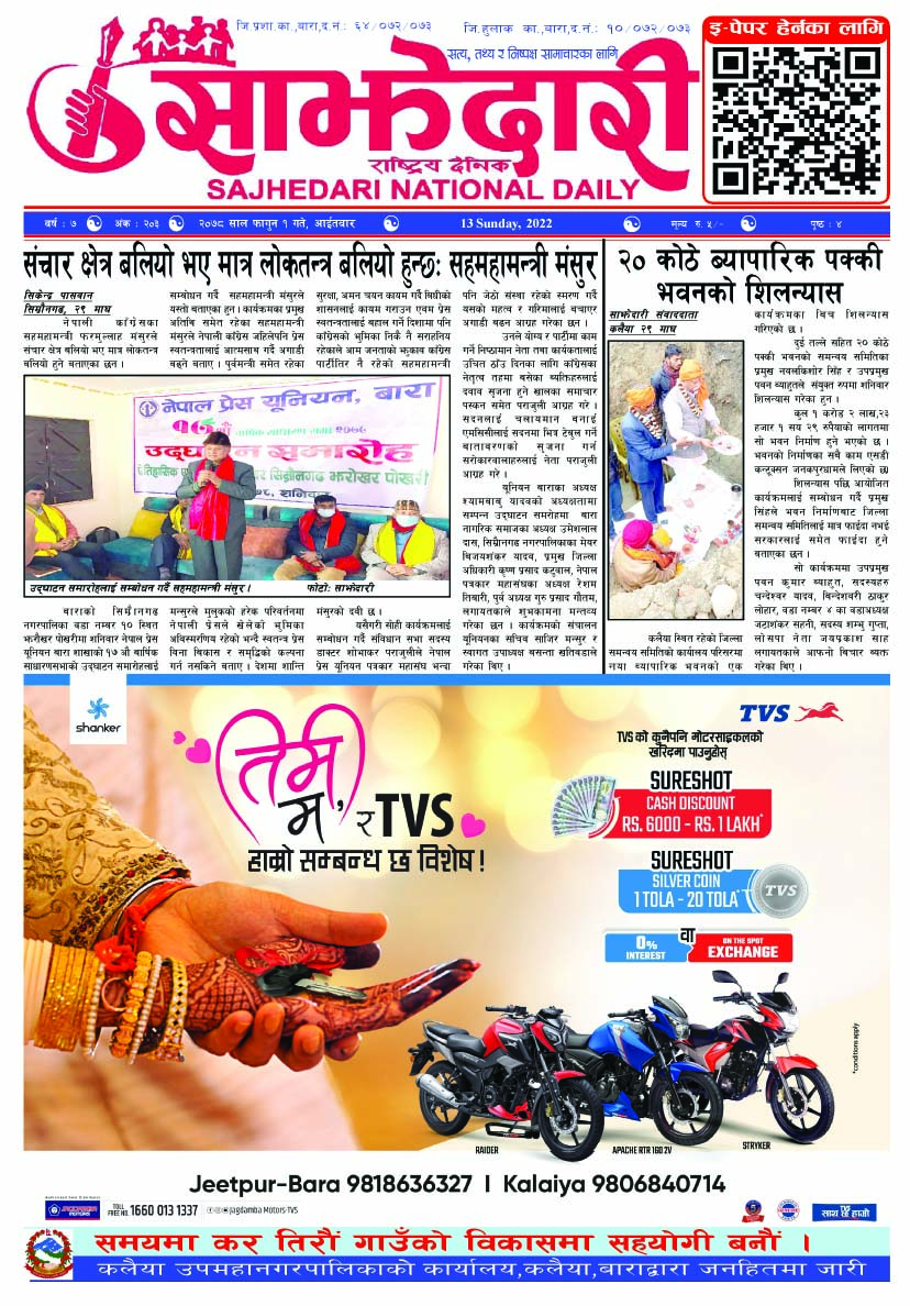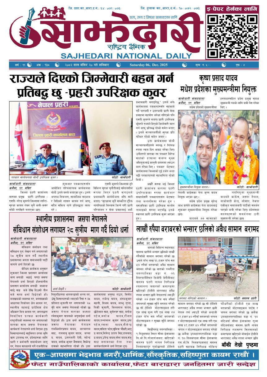 ई–पेपर २०८२ मंसिर २० गते । साझेदारी दैनिक साझेदारी दैनिक २०८२ मंसिर २०, गते 254 पाठक संख्या शेयर शेयर Leave a review Leave a review Leave a Review Cancel replyYour email address will not be published. Required fields are marked * Please select a rating! Your Rating Rate… Perfect Good Average Not that Bad Very Poor Your Comment *नाम * Your Email * Your website Save my name, email, and website in this browser for the next time I comment. ताजा अपडेट दुर्घटना न्यूनीकरणलाई केन्द्रमा राखेर काम गर्न डीआईजी थपलियाको निर्देशन मधेश मुख्य समाचार समाचार कलैयामा घरको ताला तोडेर करिब ५० लाख बराबरको चोरी मधेश मुख्य समाचार समाचार प्रधानमन्त्री कप क्रिकेटको उपाधि त्रिभुवन आर्मी क्लबलाई खेलकुद मधेश मुख्य समाचार समाचार लागुऔषधसहित विभिन्न स्थानबाट २४ जना पक्राउ प्रदेश समाचार समाचार सुनचाँदीको मूल्य घट्यो समाचार भन्सार छली प्रकरणः तीन जनाविरुद्ध अदालतमा मुद्दा, मुख्य अभियुक्तबाट २ करोडभन्दा बढी बिगो दाबी मधेश मुख्य समाचार समाचार जीतपुरको गौशाला जग्गा अतिक्रमण घरटहरा हटाइयो मधेश मुख्य समाचार समाचार मुख्य समाचार बारामा भूतपूर्व सैनिक पुनर्मिलन कार्यक्रम सम्पन्न मधेश समाचार पाँच पटक भन्दाबढी ट्राफिक नियम उल्लंघन गर्नेको लाइसेन्स निलम्बन प्रक्रिया सुरु मधेश मुख्य समाचार समाचार बाराका दुई नगरपालिकामा नयाँ प्रमुख प्रशासकीय अधिकृत खटाइए मधेश मुख्य समाचार समाचार पर्सामा नागरिकतासँगै राष्ट्रिय परिचयपत्र मधेश मुख्य समाचार समाचार राजश्व अनुसन्धान कार्यालय पथलैयामा आगलागी, प्रमुखको कार्यकक्ष ध्वस्त मधेश समाचार प्रदेश समाचार भाडा वृद्धि पछि सिमरा-काठमाडौं उडानमा यात्रु घटे मधेश मुख्य समाचार समाचार बारामा साढे दुई महिनामा एक करोडभन्दा बढीको अवैध सामान बरामद मधेश मुख्य समाचार समाचार सांसद साहलाई जीतपुरसिमरा-१७ का वडाबासीद्वारा ध्यानाकर्षणपत्र बुझाइयो मधेश मुख्य समाचार समाचार प्रधानमन्त्री कपको आजको खेलमा मधेस प्रदेश विजयी खेलकुद मधेश समाचार स्थानीय तहसँग मागियो विद्यालय समायोजनको विवरण प्रदेश समाचार समाचार
