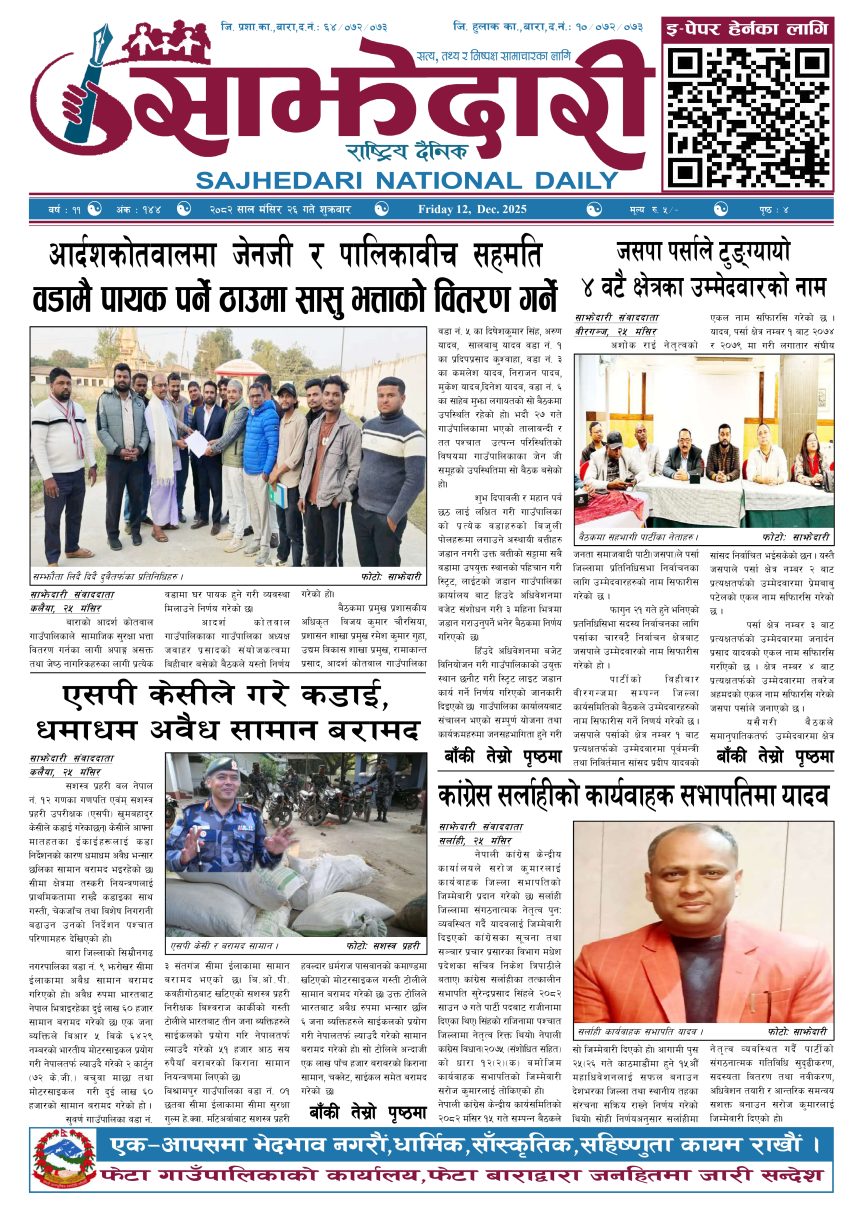 ई–पेपर २०८२ मंसिर २६ गते । साझेदारी दैनिक साझेदारी दैनिक २०८२ मंसिर २६, गते 302 पाठक संख्या शेयर शेयर Leave a review Leave a review Leave a Review Cancel replyYour email address will not be published. Required fields are marked * Please select a rating! Your Rating Rate… Perfect Good Average Not that Bad Very Poor Your Comment *नाम * Your Email * Your website Save my name, email, and website in this browser for the next time I comment. ताजा अपडेट २०८३ वैशाख ०६ गते । साझेदारी दैनिक ई–पेपर करैयामाई -६ सिहोर्वामा नि:शुल्क स्वास्थ्य शिविर सम्पन्न मधेश समाचार स्वास्थ्य बारामा खेतबाट घर फर्किँदै गर्दा चट्याङ लागेर एक जनाको मृत्यु मधेश मुख्य समाचार समाचार बृन्दावनमा ६ सुकुम्बासी परिवार विस्थापित मधेश समाचार सुनसरीमा काँचो केरासहित चार जना पक्राउ मधेश मुख्य समाचार समाचार २०८३ वैशाख ०५ गते । साझेदारी दैनिक ई–पेपर दुर्घटना न्यूनीकरणलाई केन्द्रमा राखेर काम गर्न डीआईजी थपलियाको निर्देशन मधेश मुख्य समाचार समाचार मुख्य समाचार कलैयामा घरको ताला तोडेर करिब ५० लाख बराबरको चोरी मधेश मुख्य समाचार समाचार प्रधानमन्त्री कप क्रिकेटको उपाधि त्रिभुवन आर्मी क्लबलाई खेलकुद मधेश मुख्य समाचार समाचार भन्सार छली प्रकरणः तीन जनाविरुद्ध अदालतमा मुद्दा, मुख्य अभियुक्तबाट २ करोडभन्दा बढी बिगो दाबी मधेश मुख्य समाचार समाचार जीतपुरको गौशाला जग्गा अतिक्रमण घरटहरा हटाइयो मधेश मुख्य समाचार समाचार बारामा भूतपूर्व सैनिक पुनर्मिलन कार्यक्रम सम्पन्न मधेश समाचार प्रदेश समाचार लागुऔषधसहित विभिन्न स्थानबाट २४ जना पक्राउ प्रदेश समाचार समाचार पाँच पटक भन्दाबढी ट्राफिक नियम उल्लंघन गर्नेको लाइसेन्स निलम्बन प्रक्रिया सुरु मधेश मुख्य समाचार समाचार बाराका दुई नगरपालिकामा नयाँ प्रमुख प्रशासकीय अधिकृत खटाइए मधेश मुख्य समाचार समाचार पर्सामा नागरिकतासँगै राष्ट्रिय परिचयपत्र मधेश मुख्य समाचार समाचार राजश्व अनुसन्धान कार्यालय पथलैयामा आगलागी, प्रमुखको कार्यकक्ष ध्वस्त मधेश समाचार