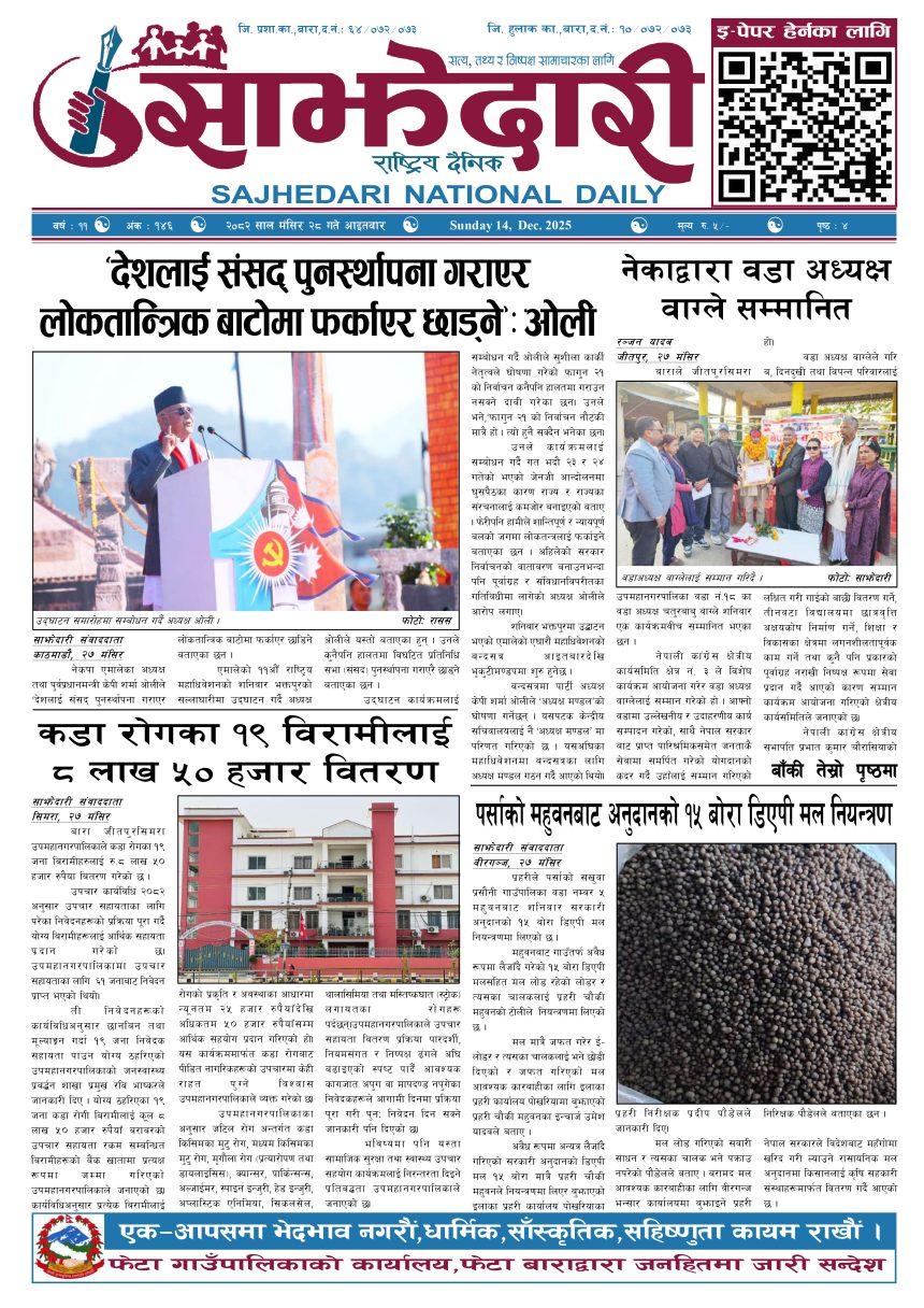 ई–पेपर २०८२ मंसिर २८ गते । साझेदारी दैनिक साझेदारी दैनिक २०८२ मंसिर २८, गते 273 पाठक संख्या शेयर शेयर Leave a review Leave a review Leave a Review Cancel replyYour email address will not be published. Required fields are marked * Please select a rating! Your Rating Rate… Perfect Good Average Not that Bad Very Poor Your Comment *नाम * Your Email * Your website Save my name, email, and website in this browser for the next time I comment. ताजा अपडेट तेइस लाख बालकालिकालाई भिटामिन ‘ए’ खुवाइयो समाचार स्वास्थ्य पर्सामा लागूऔषध गाँजा जस्तो पदार्थसहित चार भारतीय नागरिक पक्राउ मधेश समाचार चक्कु प्रहार गरी युवकको हत्या समाचार बनावटी अडियो काण्ड : प्रहरी वरिष्ठ नायव निरीक्षक सागर शमसेर ज.ब.रा. निलम्बन प्रक्रियामा मधेश मुख्य समाचार समाचार १९ औं स्थापना दिवसको अवसरमा ३७ जनाद्वारा रक्तदान मधेश समाचार वीरगञ्ज भन्सारद्वारा नौ महिनामा एक खर्ब ७७ करोड राजस्व सङ्कलन मधेश समाचार व्यवसाय सञ्चालनमा पारदर्शिता र नियम पालना गर्न जीतपुरसिमरा उद्योग वाणिज्य संघको आग्रह मधेश समाचार मुख्य समाचार पथलैया-चुरियामाई सडक क्षेत्रका संरचना हटाउन ३ दिनको अल्टिमेटम मधेश मुख्य समाचार समाचार सिमरामा ‘केआईईसी’को नयाँ शाखा सञ्चालन,विदेश अध्ययन चाहने विद्यार्थीलाई सहज मधेश मुख्य समाचार समाचार पहिलेको निर्णय फेरियो : कलैयामा अब वैशाख १६ देखि कक्षा सुरु हुने मधेश मुख्य समाचार समाचार कलैयामा वैशाख १५ गतेदेखि भर्ना अभियान, २१ गतेदेखि पठनपाठन सुरु हुने मधेश मुख्य समाचार समाचार पर्सा राष्ट्रिय निकुञ्जमा वन्यजन्तु उद्धार केन्द्र उद्घाटन मधेश समाचार प्रदेश समाचार कलैयामा खसी मासुको छालासहित र बिना छालाको छुट्टाछुट्टै मूल्य निर्धारण मधेश समाचार सिम्रौनगढमा छाडा कुकुरको आतंक : एकै घरका ८ खसी-बाख्रा मरे मधेश मुख्य समाचार समाचार रेल्वे सेवा ७९ करोड ऋणमा मधेश समाचार सडक विस्तारले वीरगञ्जको विद्युत् अवरुद्ध मधेश मुख्य समाचार समाचार बाईपास विस्तारका लागि २४ घण्टाभित्र संरचना हटाउन वीरगञ्ज महानगरको निर्देशन मधेश मुख्य समाचार समाचार