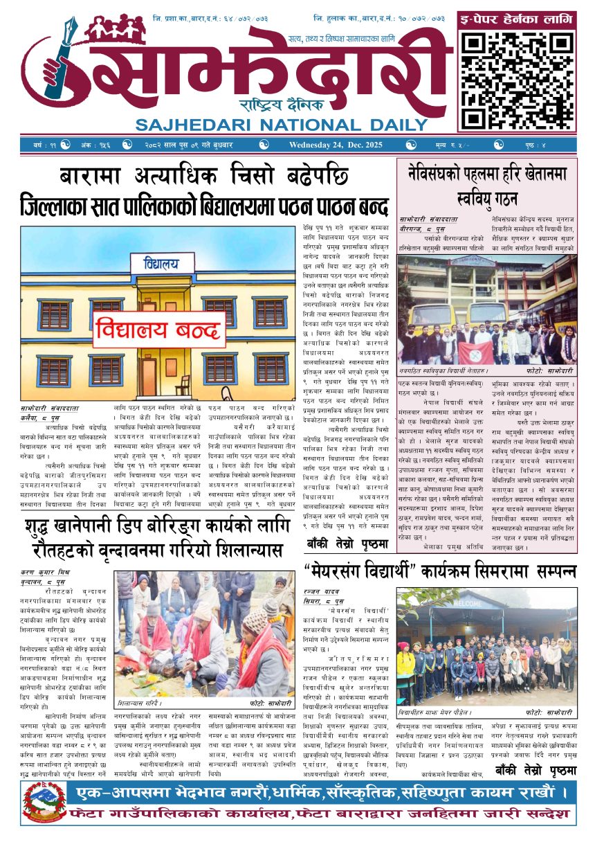 ई–पेपर २०८२ पुस ०९ गते । साझेदारी दैनिक साझेदारी दैनिक २०८२ पुष ९, गते 293 पाठक संख्या शेयर शेयर Leave a review Leave a review Leave a Review Cancel replyYour email address will not be published. Required fields are marked * Please select a rating! Your Rating Rate… Perfect Good Average Not that Bad Very Poor Your Comment *नाम * Your Email * Your website Save my name, email, and website in this browser for the next time I comment. ताजा अपडेट रास्वपाको महामन्त्रीमा शाह मनोनित राजनीति समाचार पहिलेको निर्णय फेरियो : कलैयामा अब वैशाख १६ देखि कक्षा सुरु हुने मधेश मुख्य समाचार समाचार कलैयामा वैशाख १५ गतेदेखि भर्ना अभियान, २१ गतेदेखि पठनपाठन सुरु हुने मधेश मुख्य समाचार समाचार पेट्रोलियम पदार्थमा गरिएको मूल्य वृद्धि फिर्ता लिन अध्यक्ष घिसिङको माग समाचार पर्सा राष्ट्रिय निकुञ्जमा वन्यजन्तु उद्धार केन्द्र उद्घाटन मधेश समाचार कलैयामा खसी मासुको छालासहित र बिना छालाको छुट्टाछुट्टै मूल्य निर्धारण मधेश समाचार सिम्रौनगढमा छाडा कुकुरको आतंक : एकै घरका ८ खसी-बाख्रा मरे मधेश मुख्य समाचार समाचार मुख्य समाचार रेल्वे सेवा ७९ करोड ऋणमा मधेश समाचार सडक विस्तारले वीरगञ्जको विद्युत् अवरुद्ध मधेश मुख्य समाचार समाचार बाईपास विस्तारका लागि २४ घण्टाभित्र संरचना हटाउन वीरगञ्ज महानगरको निर्देशन मधेश मुख्य समाचार समाचार वीरगञ्जमा भर्ना अभियान वैशाख ७ गतेदेखि सुरु हुने मधेश समाचार वीरगन्जमा अतिक्रमित संरचना भत्काउन सुरु मधेश मुख्य समाचार समाचार प्रदेश समाचार जीतपुरसिमराको बिद्यालयमा पठनपाठन वैशाख १४ गते देखि सुरु हुने मधेश मुख्य समाचार समाचार करैयामाई -६ सिहोर्वामा नि:शुल्क स्वास्थ्य शिविर सम्पन्न मधेश समाचार स्वास्थ्य बारामा खेतबाट घर फर्किँदै गर्दा चट्याङ लागेर एक जनाको मृत्यु मधेश मुख्य समाचार समाचार बृन्दावनमा ६ सुकुम्बासी परिवार विस्थापित मधेश समाचार सुनसरीमा काँचो केरासहित चार जना पक्राउ मधेश मुख्य समाचार समाचार