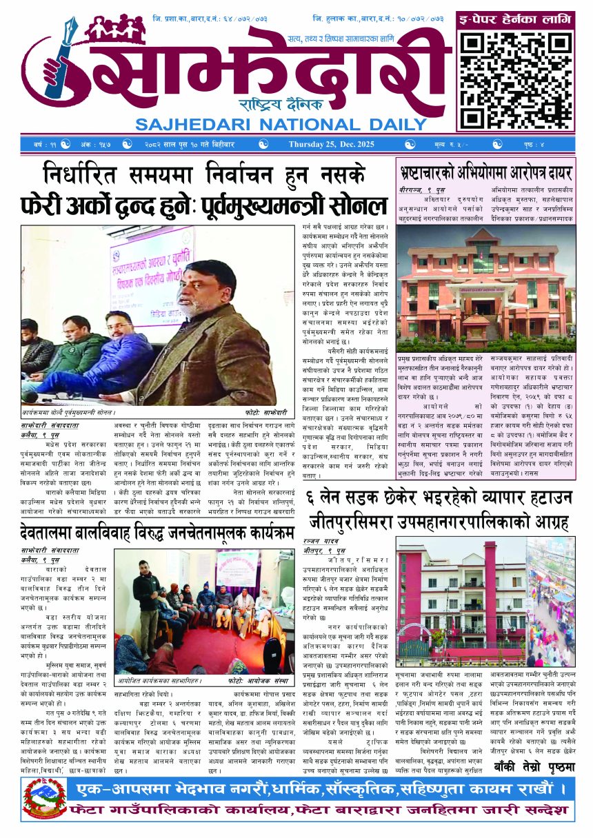 ई–पेपर २०८२ पुस १० गते । साझेदारी दैनिक साझेदारी दैनिक २०८२ पुष १०, गते 145 पाठक संख्या शेयर शेयर Leave a review Leave a review Leave a Review Cancel replyYour email address will not be published. Required fields are marked * Please select a rating! Your Rating Rate… Perfect Good Average Not that Bad Very Poor Your Comment *नाम * Your Email * Your website Save my name, email, and website in this browser for the next time I comment. ताजा अपडेट रेल्वे सेवा ७९ करोड ऋणमा मधेश समाचार सडक विस्तारले वीरगञ्जको विद्युत् अवरुद्ध मधेश मुख्य समाचार समाचार बाईपास विस्तारका लागि २४ घण्टाभित्र संरचना हटाउन वीरगञ्ज महानगरको निर्देशन मधेश मुख्य समाचार समाचार वीरगञ्जमा भर्ना अभियान वैशाख ७ गतेदेखि सुरु हुने मधेश समाचार वीरगन्जमा अतिक्रमित संरचना भत्काउन सुरु मधेश मुख्य समाचार समाचार जीतपुरसिमराको बिद्यालयमा पठनपाठन वैशाख १४ गते देखि सुरु हुने मधेश मुख्य समाचार समाचार २०८३ वैशाख ०६ गते । साझेदारी दैनिक ई–पेपर मुख्य समाचार करैयामाई -६ सिहोर्वामा नि:शुल्क स्वास्थ्य शिविर सम्पन्न मधेश समाचार स्वास्थ्य बारामा खेतबाट घर फर्किँदै गर्दा चट्याङ लागेर एक जनाको मृत्यु मधेश मुख्य समाचार समाचार बृन्दावनमा ६ सुकुम्बासी परिवार विस्थापित मधेश समाचार सुनसरीमा काँचो केरासहित चार जना पक्राउ मधेश मुख्य समाचार समाचार दुर्घटना न्यूनीकरणलाई केन्द्रमा राखेर काम गर्न डीआईजी थपलियाको निर्देशन मधेश मुख्य समाचार समाचार प्रदेश समाचार कलैयामा घरको ताला तोडेर करिब ५० लाख बराबरको चोरी मधेश मुख्य समाचार समाचार प्रधानमन्त्री कप क्रिकेटको उपाधि त्रिभुवन आर्मी क्लबलाई खेलकुद मधेश मुख्य समाचार समाचार लागुऔषधसहित विभिन्न स्थानबाट २४ जना पक्राउ प्रदेश समाचार समाचार भन्सार छली प्रकरणः तीन जनाविरुद्ध अदालतमा मुद्दा, मुख्य अभियुक्तबाट २ करोडभन्दा बढी बिगो दाबी मधेश मुख्य समाचार समाचार जीतपुरको गौशाला जग्गा अतिक्रमण घरटहरा हटाइयो मधेश मुख्य समाचार समाचार